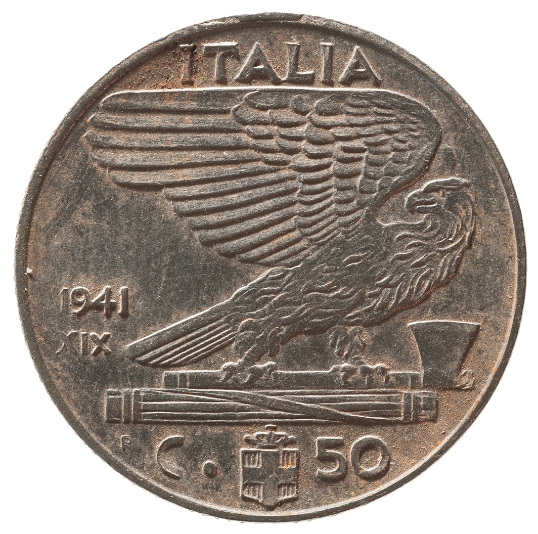Centralni dio reversa zauzima prikaz orla raširenih krila koji u kanđama drži fascio. Iznad njega nalazi se natpis ITALIA, a sa njegove desne strane godina 1941 i rimski broj XIX. U dnu na sredini nalazi se grb s čije se desne strane nalazi broj 50, a sa lijeve strane slovo C. Lijevo od slova C nalazi se malo slovo R.
