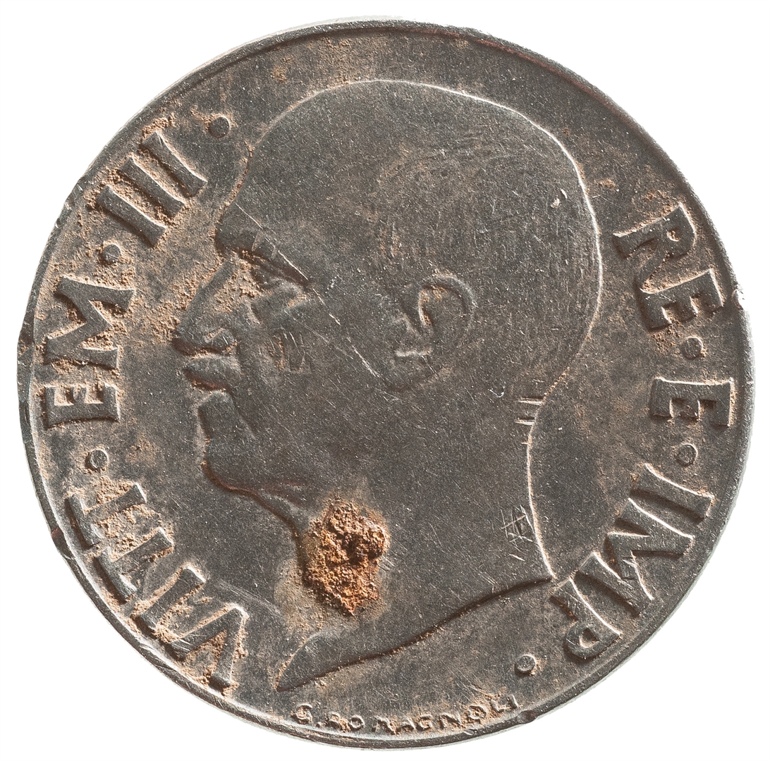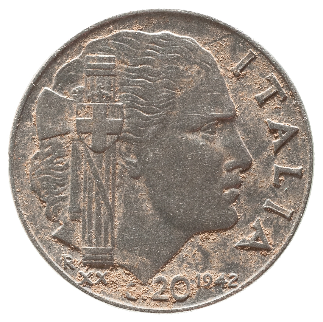 Centralni dio kovanice zauzima profil ženske osobe sa pogledom u desno. Sa njezine lijeve strane nalazi se fascio, a ispod njega slovo R i rimski brojXX. Uz desni rub nalazi se natpis ITALIA, a na dnu C.20 i godina 1942.