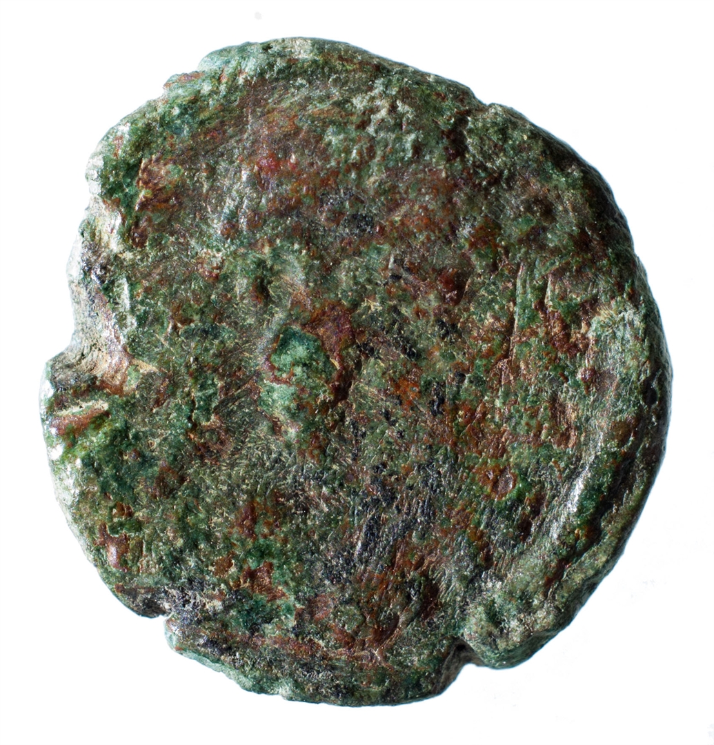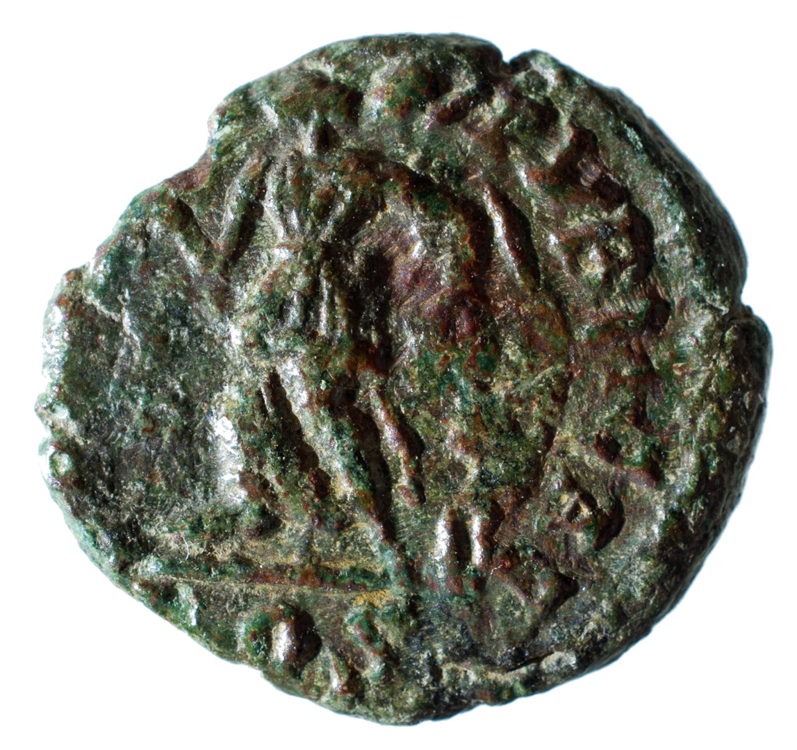 Avers: [ ]VS[ ] Poprsje nadesno. Revers: [ SALVSREI] PVBLICAE P (kristogram) AQS Viktorija stoji nadesno, desnicom pridržava koplje na ramenu, ljevicom vuče zarobljenika.