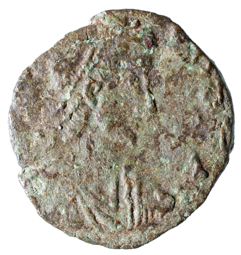 Avers: [DNHONORI] VSPFAVG Poprsje nadesno. U plaštu i oklopu, biserni dijadem. Revers: [GLORIARO ]MANO[RVM] Car stoji, pogled nalijevo. Lijeva noga lagano uzdignuta u korak nalijevo. Desnicu drži na glavi klečećeg zarobljenika s desne strane. Ljevicu ispruža nad podanika sa lijeve strane, u znak milosti.