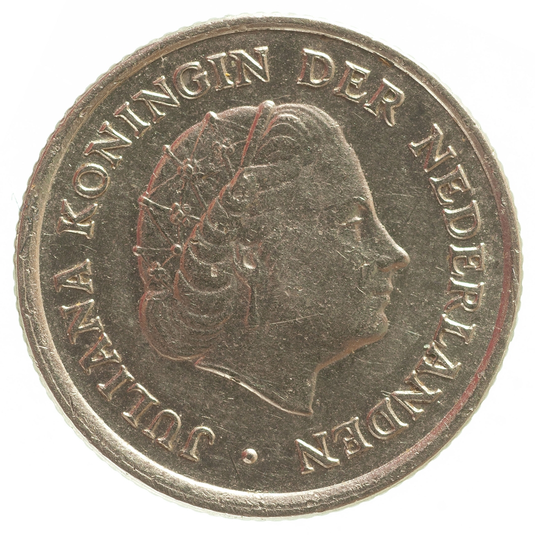 U sredini profil kraljice okrenut udesno. Kružno uz rub natpis JULIANA KONINGIN DER NEDERLENDEN.