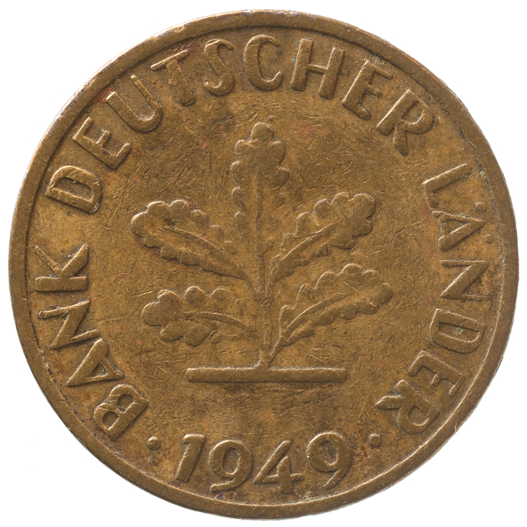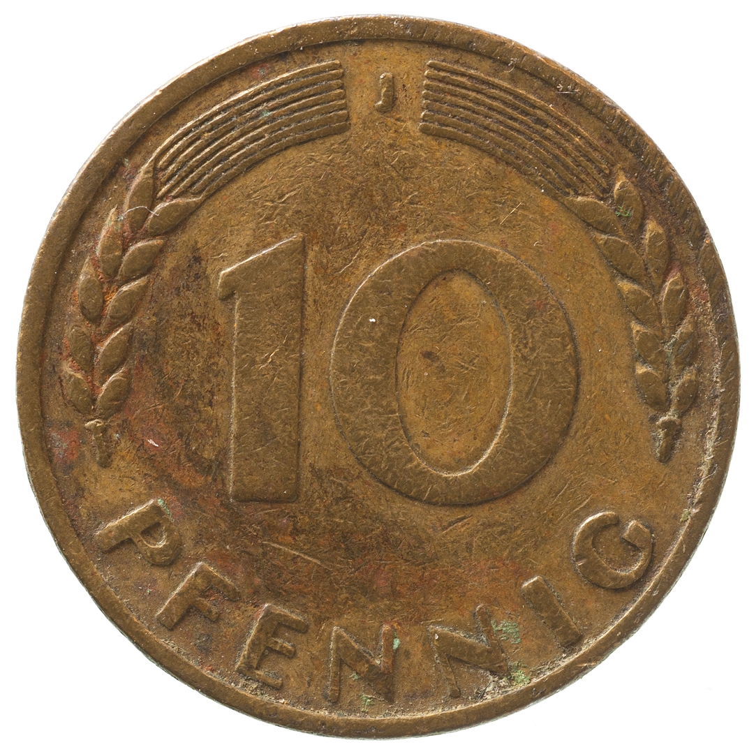 Avers: U sredini mladica hrasta s pet listova u vodoravnoj liniji. Uz rub ispisan tekst BUNDESREPUBLIK DEUTSCHLAND i godina 1949. Revers: U sredini broj 10. Na vrhu slovo J (oznaka kovnice), a uz donji rub riječ PFENNIG.