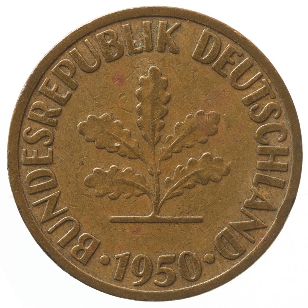 U sredini mladica hrasta s pet listova u vodoravnoj liniji. Uz rub ispisan tekst BUNDESREPUBLIK DEUTSCHLAND i godina 1950.