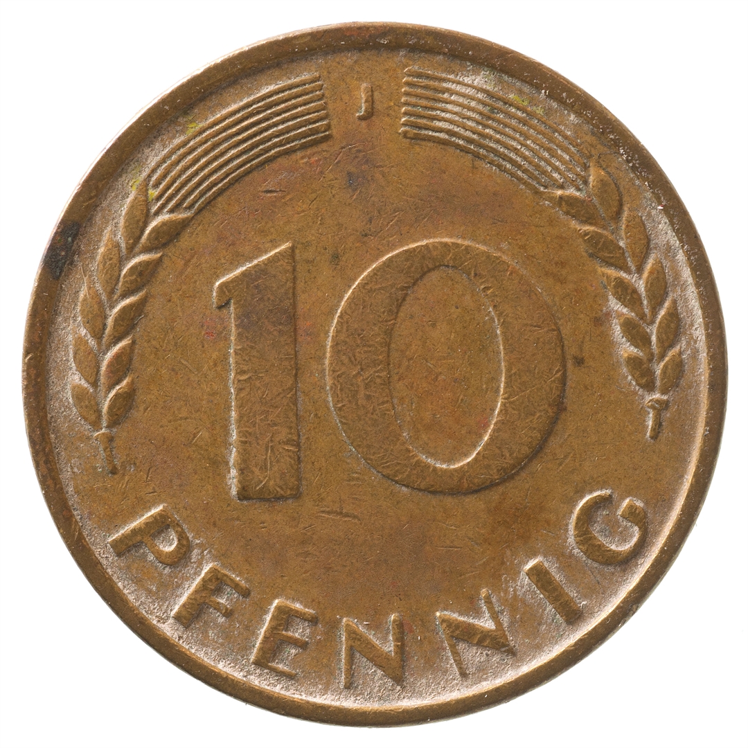 U sredini broj 10. Na vrhu slovo J (oznaka kovnice), a uz donji rub riječ PFENNIG.