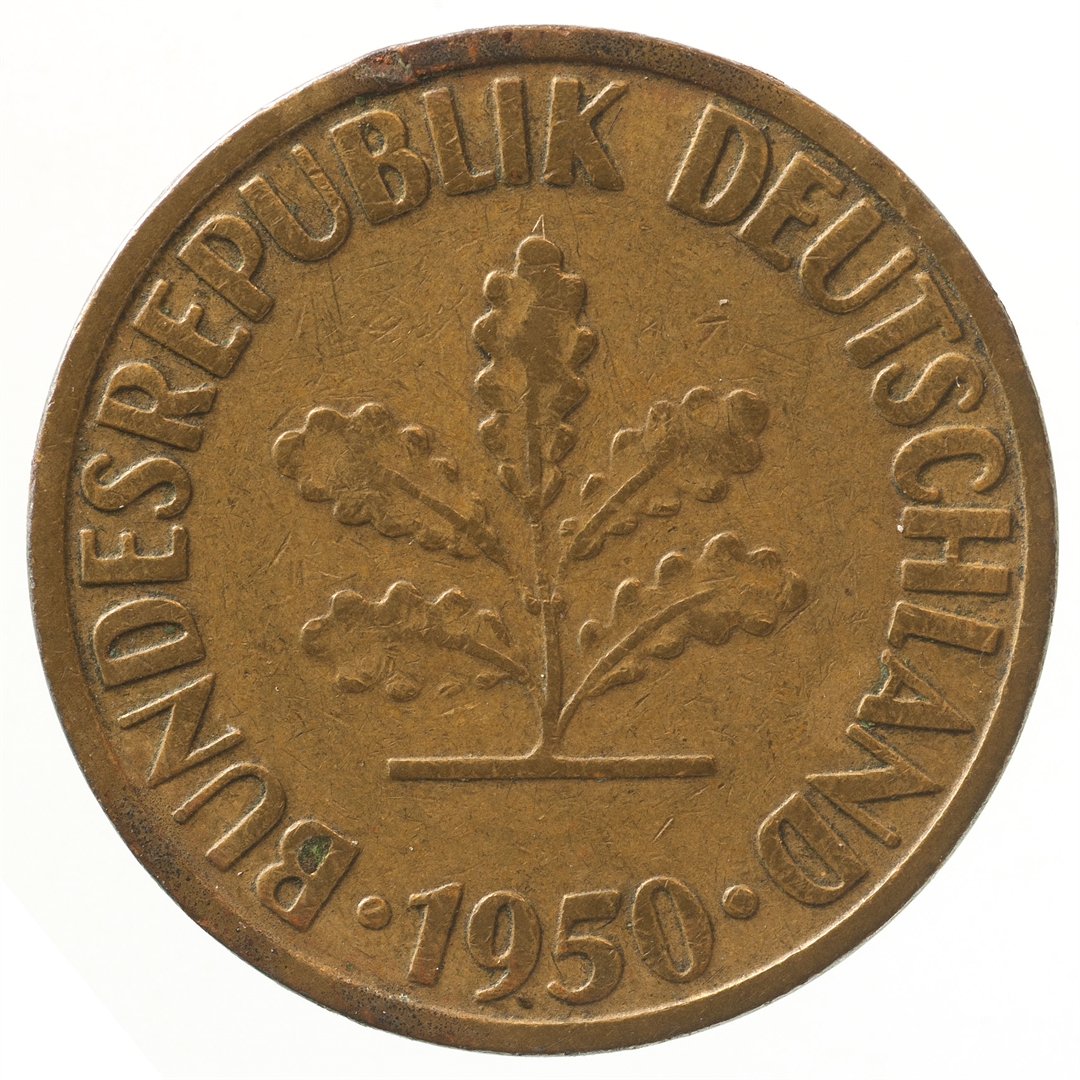 U sredini mladica hrasta s pet listova u vodoravnoj liniji. Uz rub ispisan tekst BUNDESREPUBLIK DEUTSCHLAND i godina 1950.