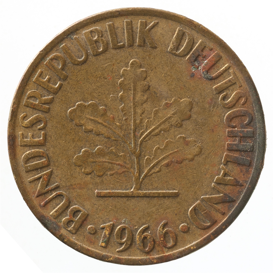 U sredini mladica hrasta s pet listova u vodoravnoj liniji. Uz rub ispisan tekst BUNDESREPUBLIK DEUTSCHLAND i godina 1966.
