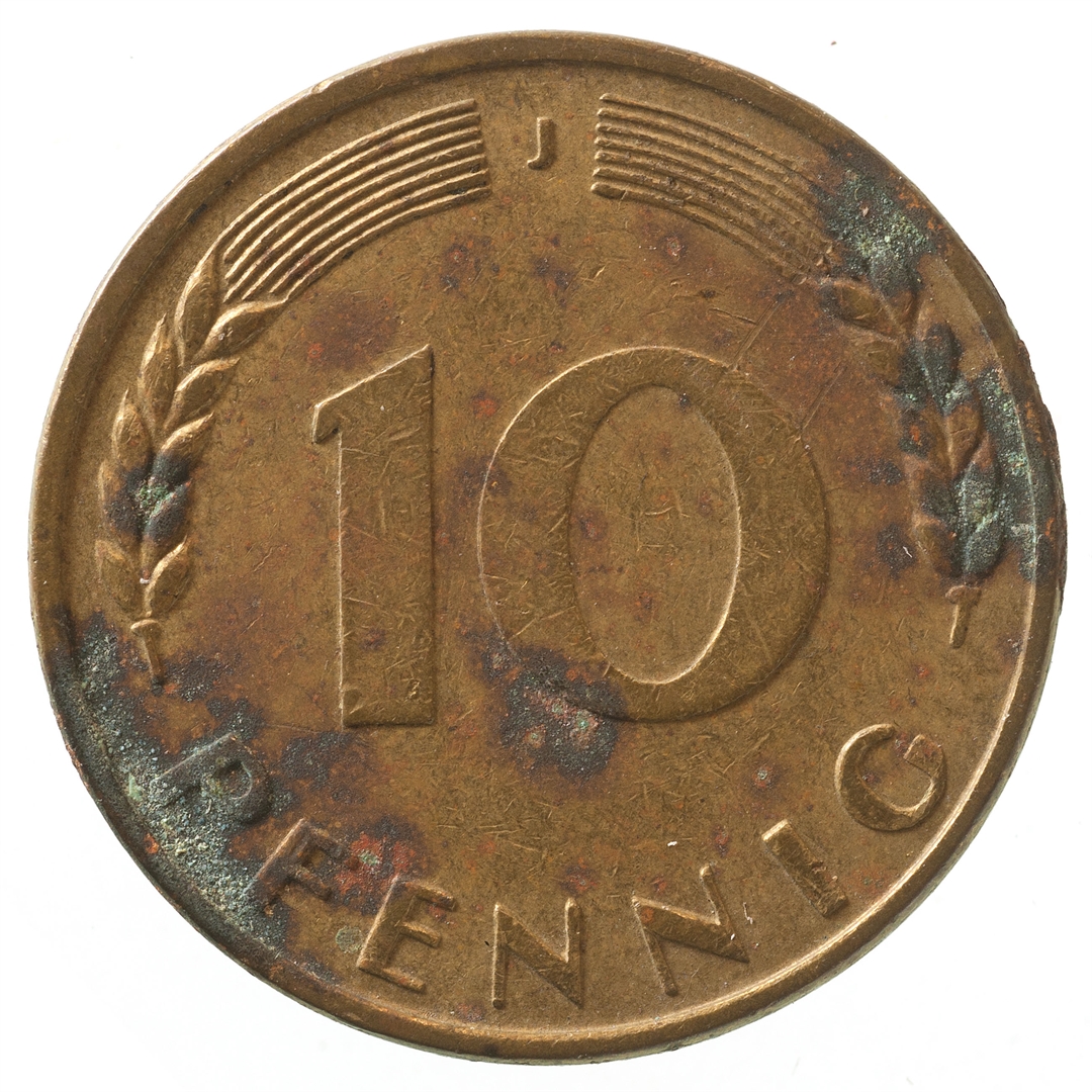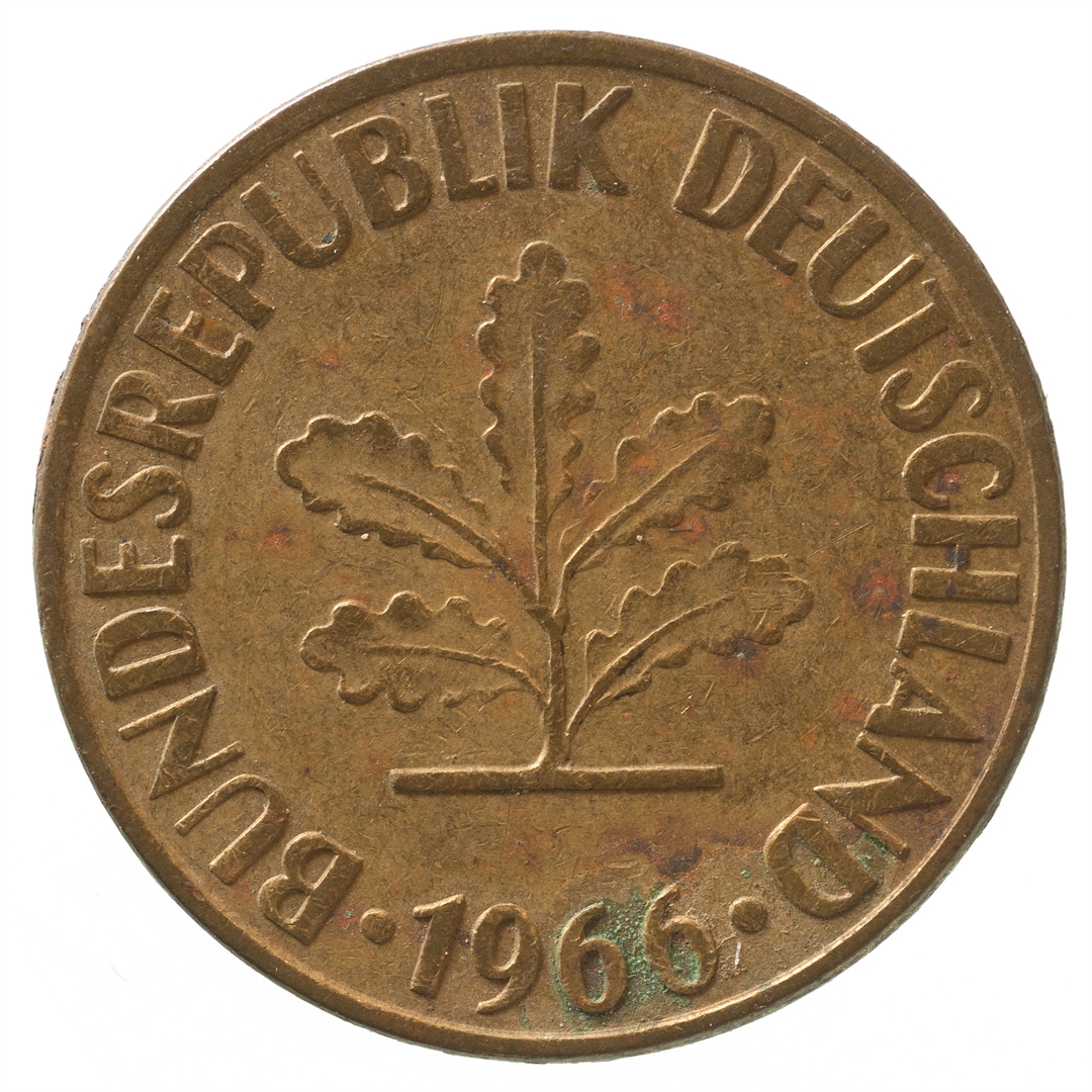 Avers: U sredini mladica hrasta s pet listova u vodoravnoj liniji. Uz rub ispisan tekst BUNDESREPUBLIK DEUTSCHLAND i godina 1966. Revers: U sredini broj 10. Na vrhu slovo J (oznaka kovnice), a uz donji rub riječ PFENNIG.