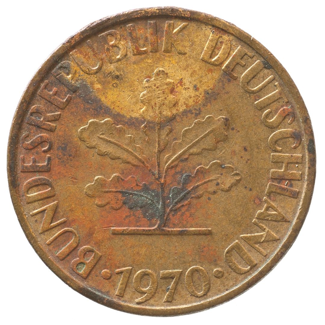 U sredini mladica hrasta s pet listova u vodoravnoj liniji. Uz rub ispisan tekst BUNDESREPUBLIK DEUTSCHLAND i godina 1970.