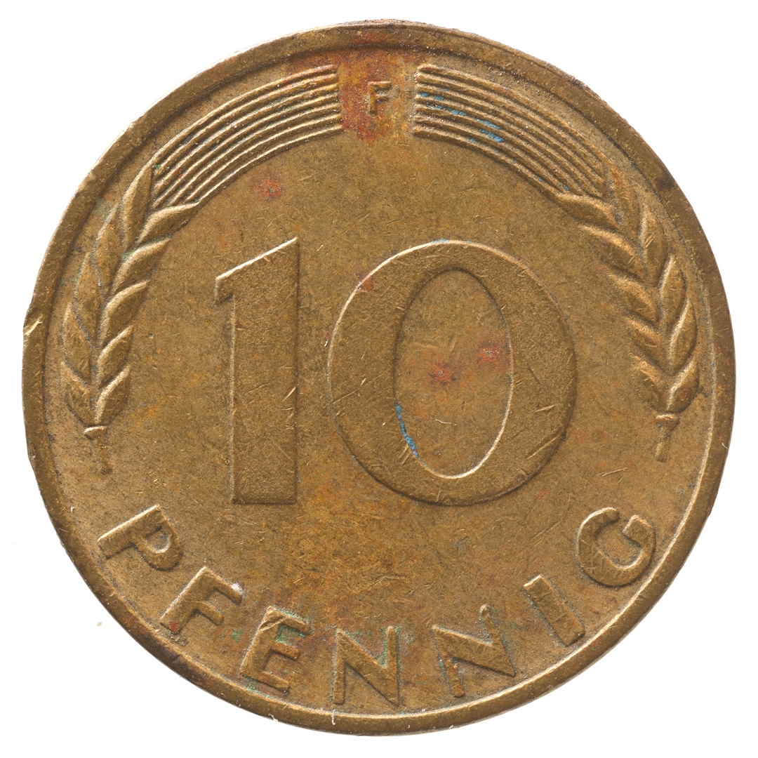 U sredini broj 10. Na vrhu slovo F (oznaka kovnice), a uz donji rub riječ PFENNIG.