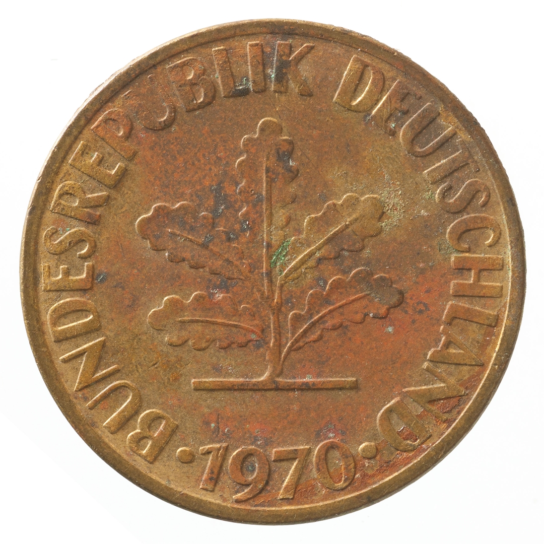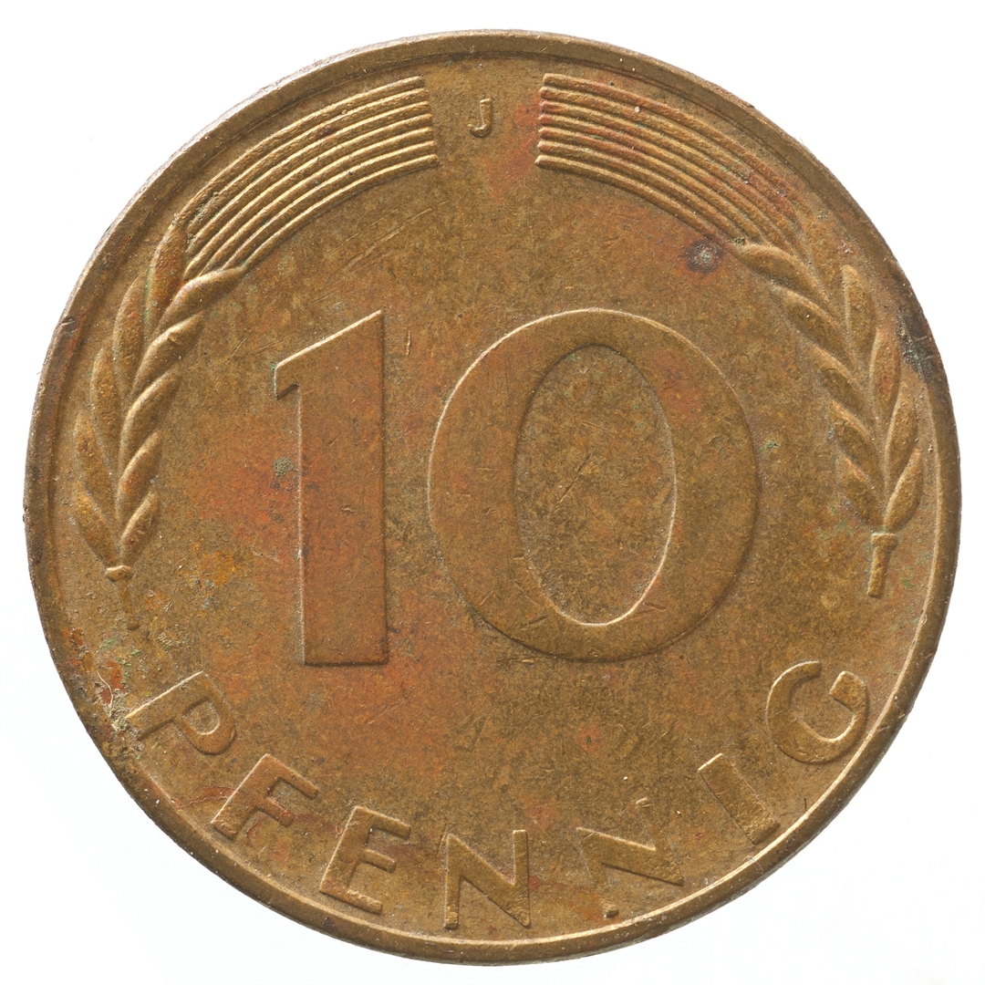 Avers: U sredini mladica hrasta s pet listova u vodoravnoj liniji. Uz rub ispisan tekst BUNDESREPUBLIK DEUTSCHLAND i godina 1970. Revers: U sredini broj 10. Na vrhu slovo J (oznaka kovnice), a uz donji rub riječ PFENNIG.