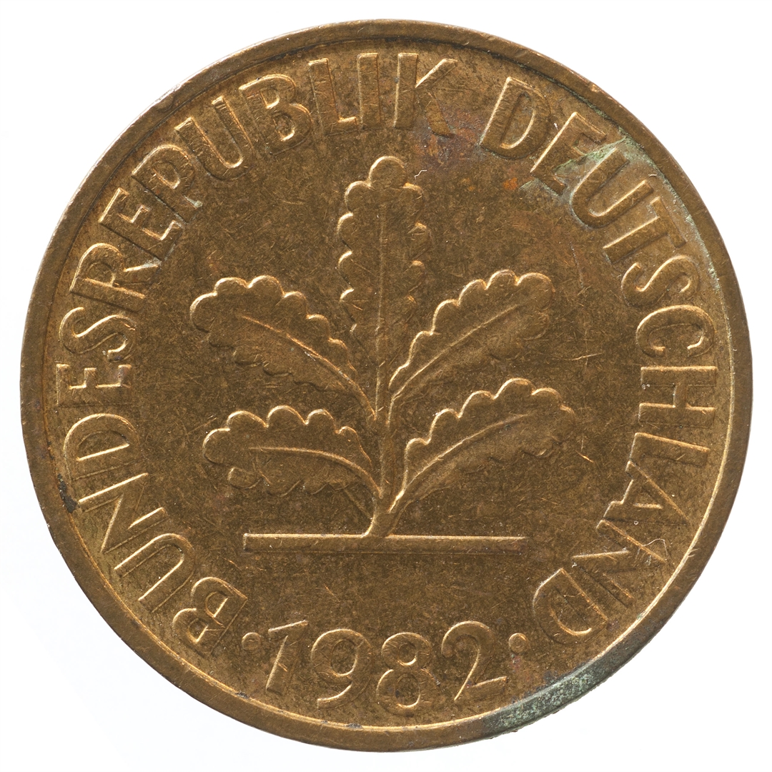 U sredini mladica hrasta s pet listova u vodoravnoj liniji. Uz rub ispisan tekst BUNDESREPUBLIK DEUTSCHLAND i godina 1982.