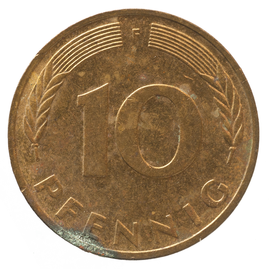 U sredini broj 10. Na vrhu slovo F (oznaka kovnice), a uz donji rub riječ PFENNIG.