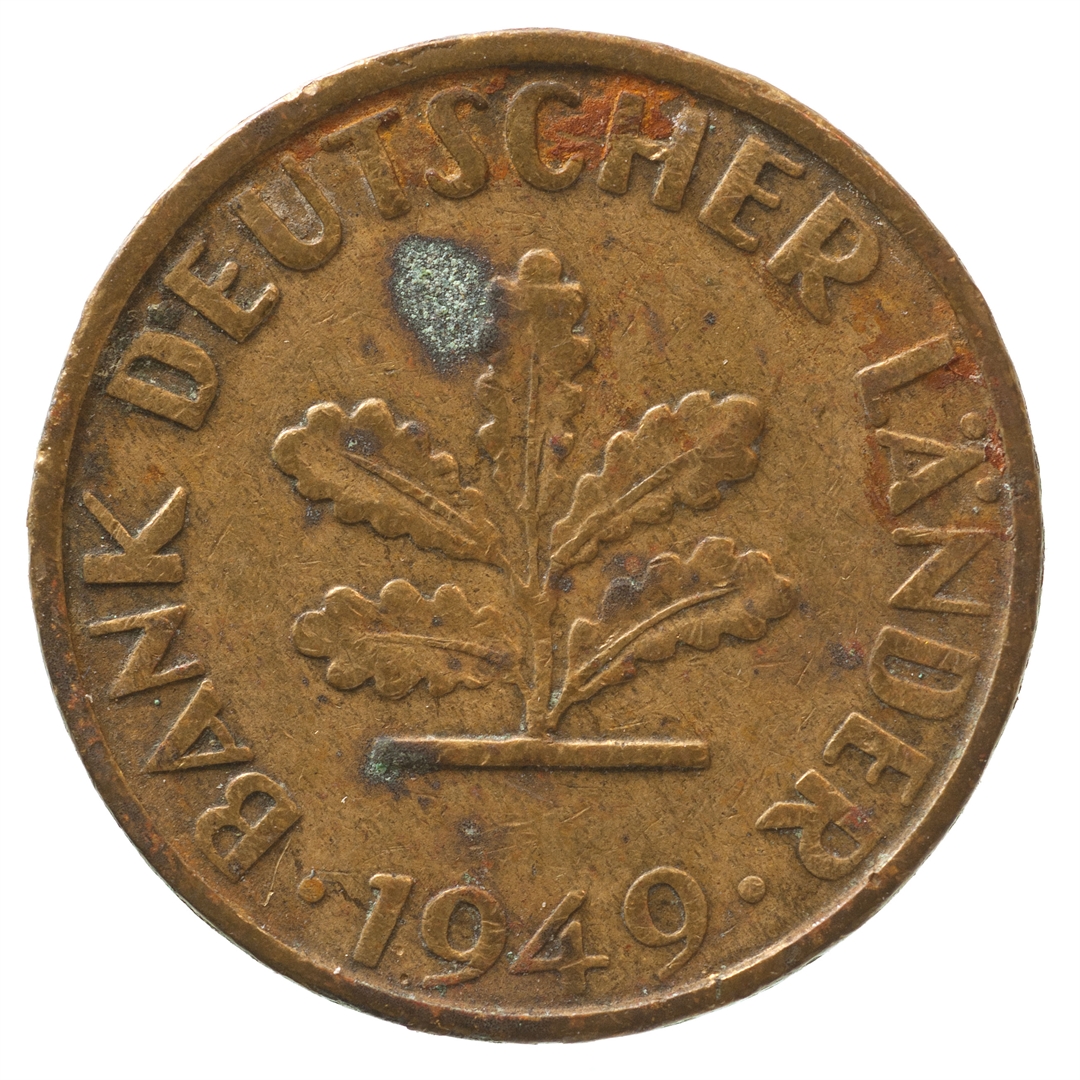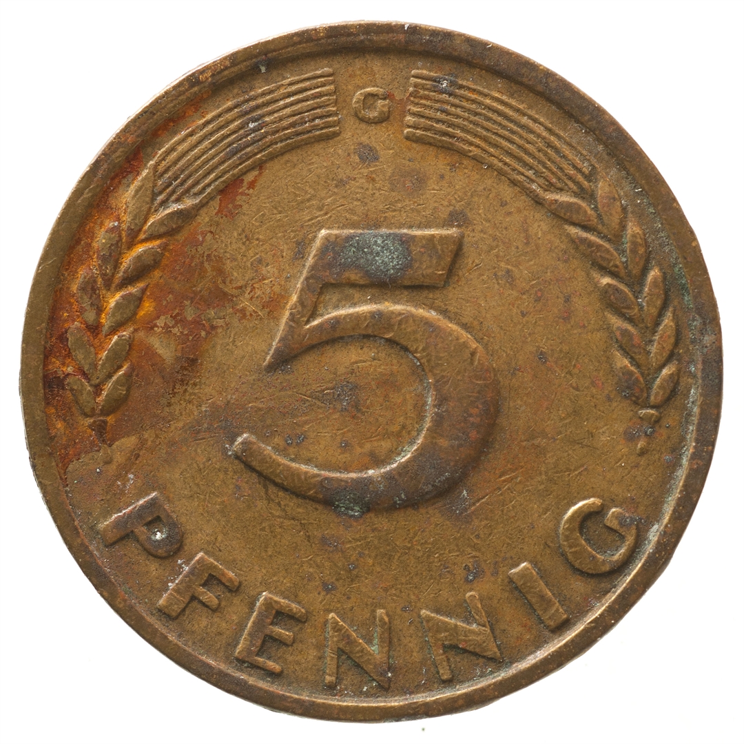 Avers: U sredini mladica hrasta s pet listova u vodoravnoj liniji. Uz rub ispisan tekst BUNDESREPUBLIK DEUTSCHLAND i godina 1949. Revers: U sredini broj 5. Na vrhu slovo G (oznaka kovnice), a uz donji rub riječ PFENNIG.