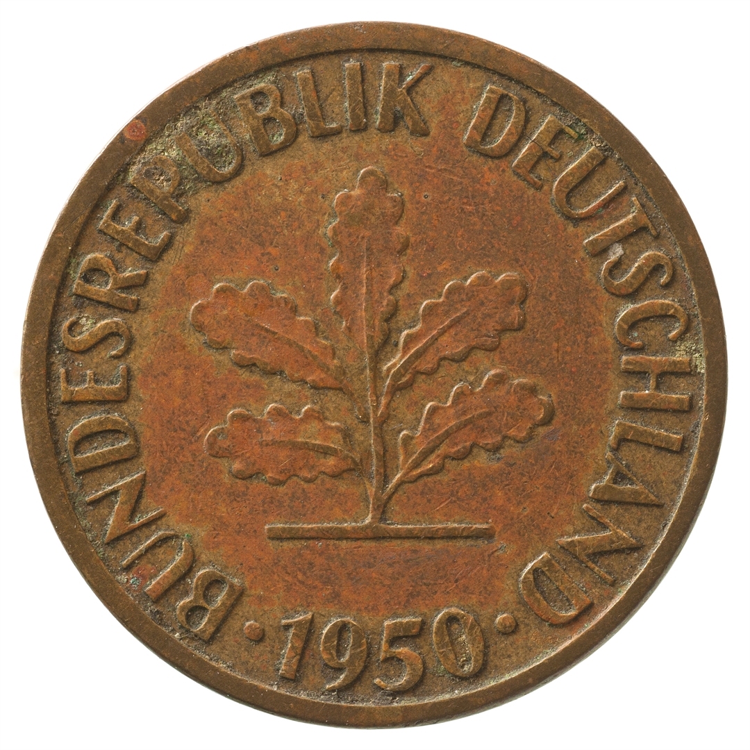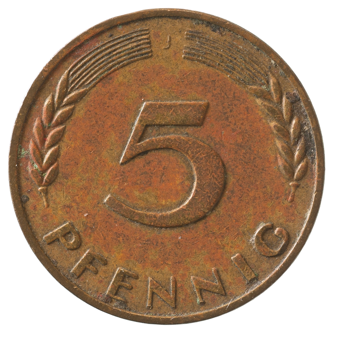 Avers: U sredini mladica hrasta s pet listova u vodoravnoj liniji. Uz rub ispisan tekst BUNDESREPUBLIK DEUTSCHLAND i godina 1950. Revers: U sredini broj 5. Na vrhu slovo J (oznaka kovnice), a uz donji rub riječ PFENNIG.