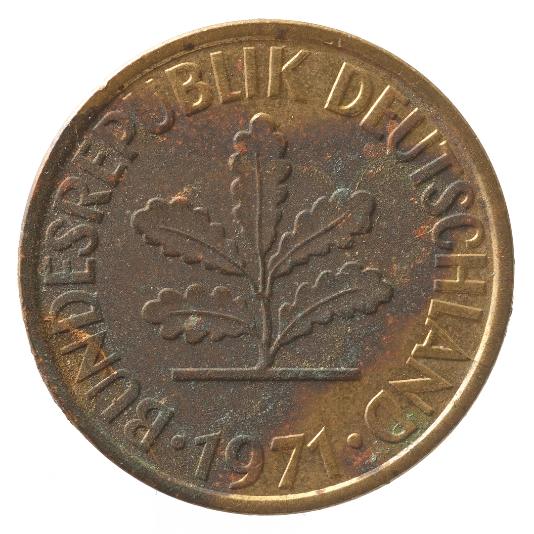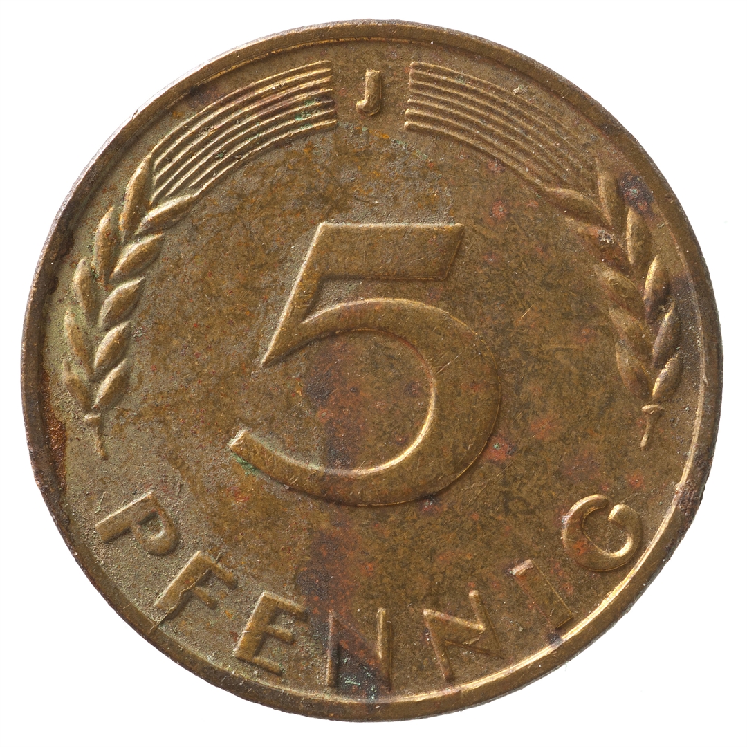 Avers: U sredini mladica hrasta s pet listova u vodoravnoj liniji. Uz rub ispisan tekst BUNDESREPUBLIK DEUTSCHLAND i godina 1971. Revers: U sredini broj 5. Na vrhu slovo J (oznaka kovnice), a uz donji rub riječ PFENNIG.