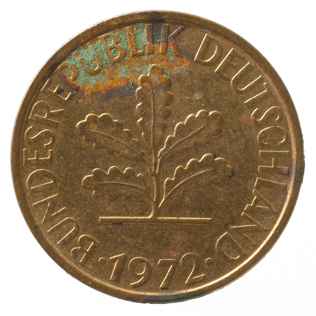 U sredini mladica hrasta s pet listova u vodoravnoj liniji. Uz rub ispisan tekst BUNDESREPUBLIK DEUTSCHLAND i godina 1972.