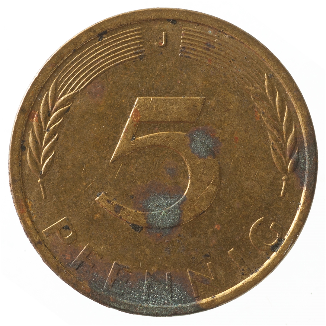 U sredini broj 5. Na vrhu slovo J (oznaka kovnice), a uz donji rub riječ PFENNIG.