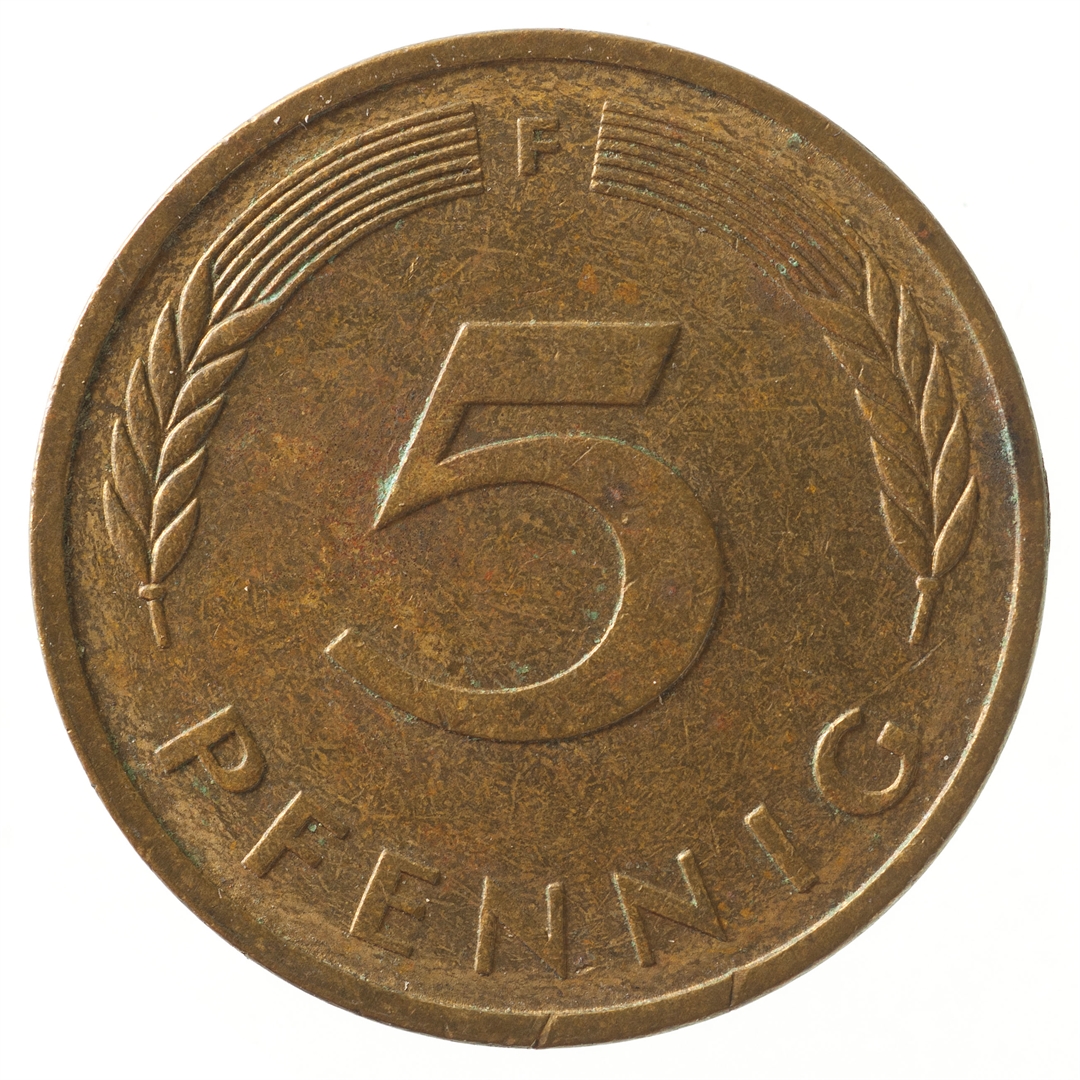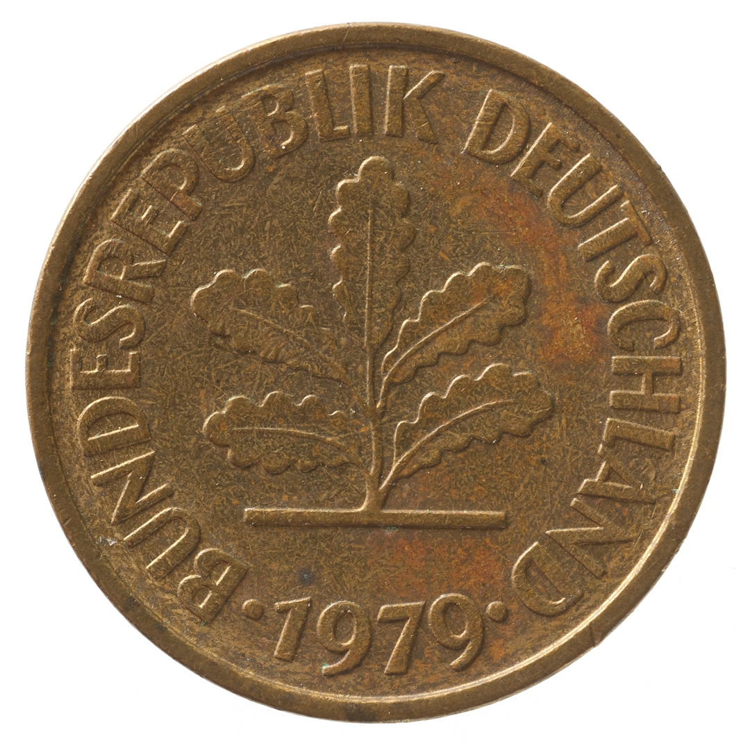 Avers: U sredini mladica hrasta s pet listova u vodoravnoj liniji. Uz rub ispisan tekst BUNDESREPUBLIK DEUTSCHLAND i godina 1979. Revers: U sredini broj 5. Na vrhu slovo F (oznaka kovnice), a uz donji rub riječ PFENNIG.
