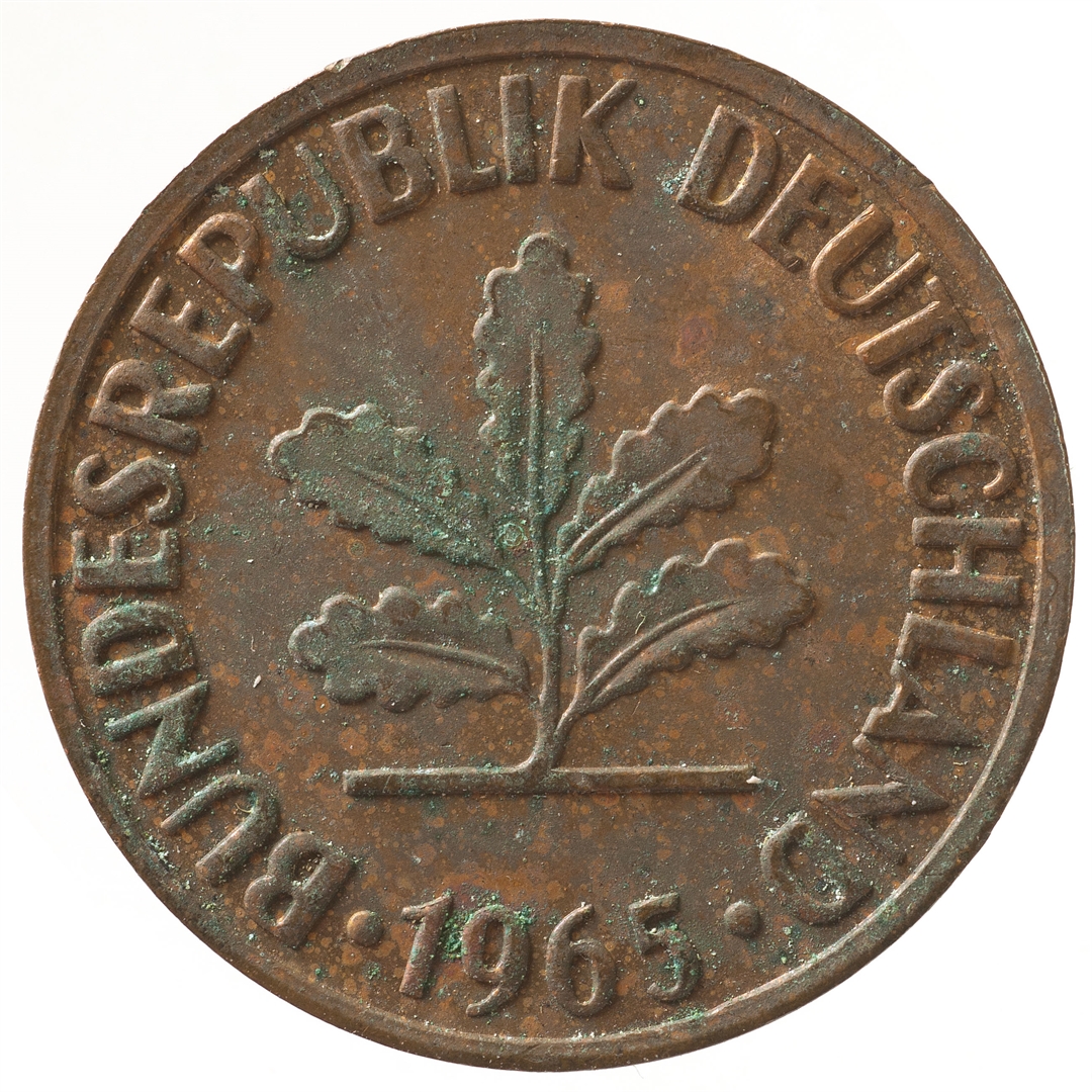 U sredini mladica hrasta s pet listova u vodoravnoj liniji. Uz rub ispisan tekst BUNDESREPUBLIK DEUTSCHLAND i godina 1965.