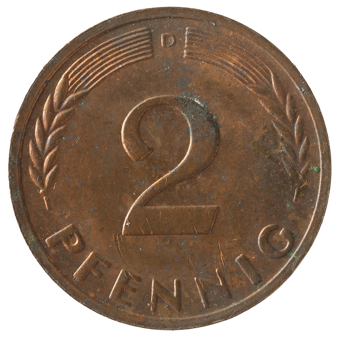 U sredini broj 2. Na vrhu slovo D (oznaka kovnice), a uz donji rub riječ PFENNIG.