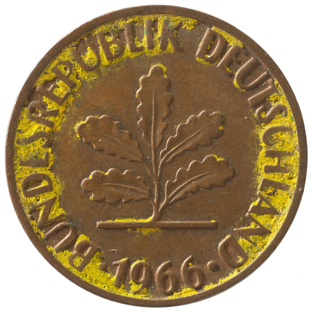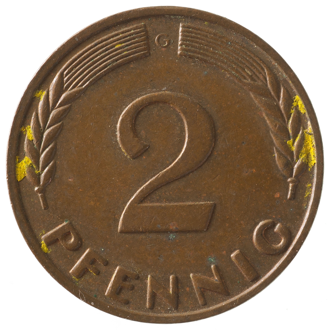 Avers: U sredini mladica hrasta s pet listova u vodoravnoj liniji. Uz rub ispisan tekst BUNDESREPUBLIK DEUTSCHLAND i godina 1966. Revers: U sredini broj 2. Na vrhu slovo G (oznaka kovnice), a uz donji rub riječ PFENNIG.