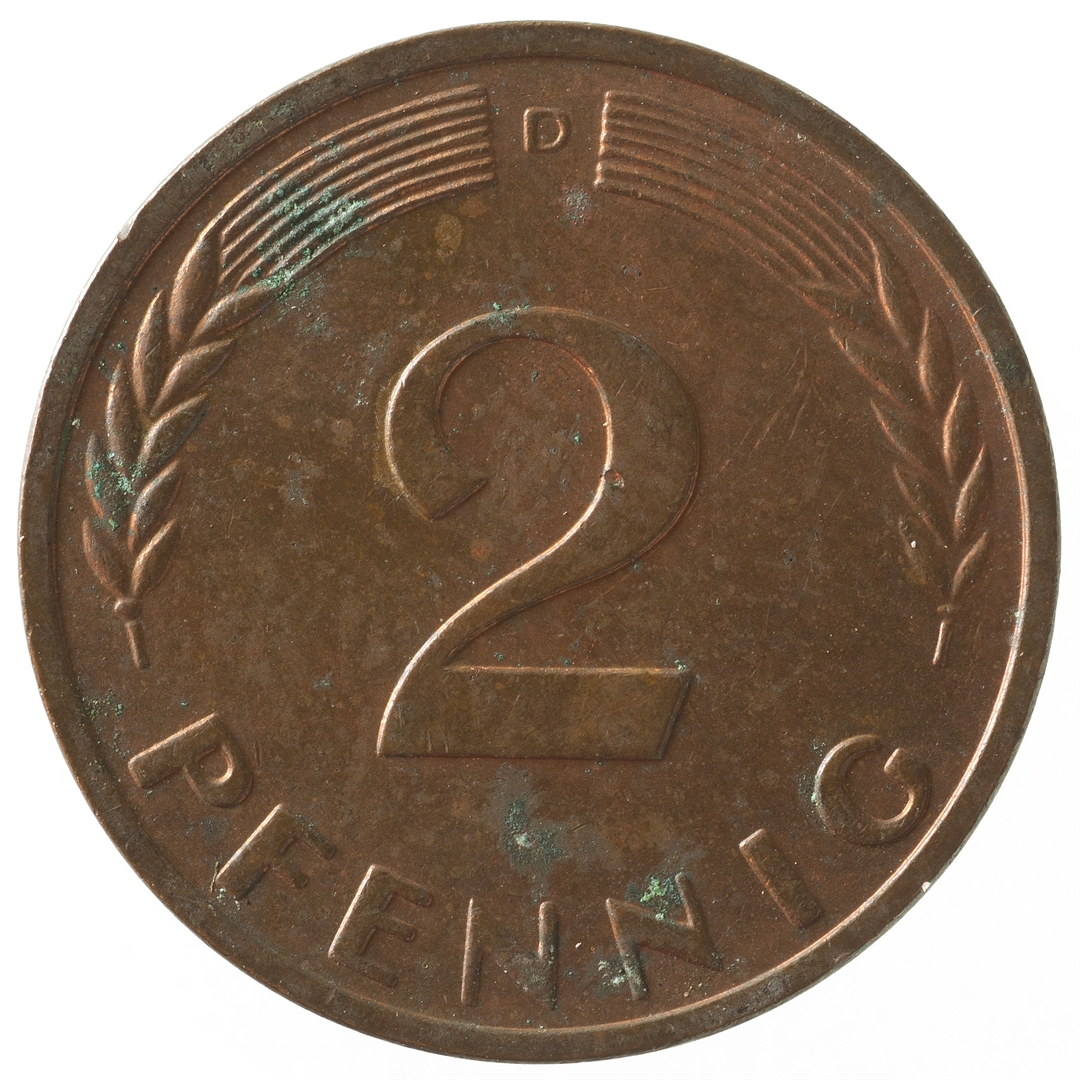 Avers: U sredini mladica hrasta s pet listova u vodoravnoj liniji. Uz rub ispisan tekst BUNDESREPUBLIK DEUTSCHLAND i godina 1966. Revers: U sredini broj 2. Na vrhu slovo D (oznaka kovnice), a uz donji rub riječ PFENNIG.