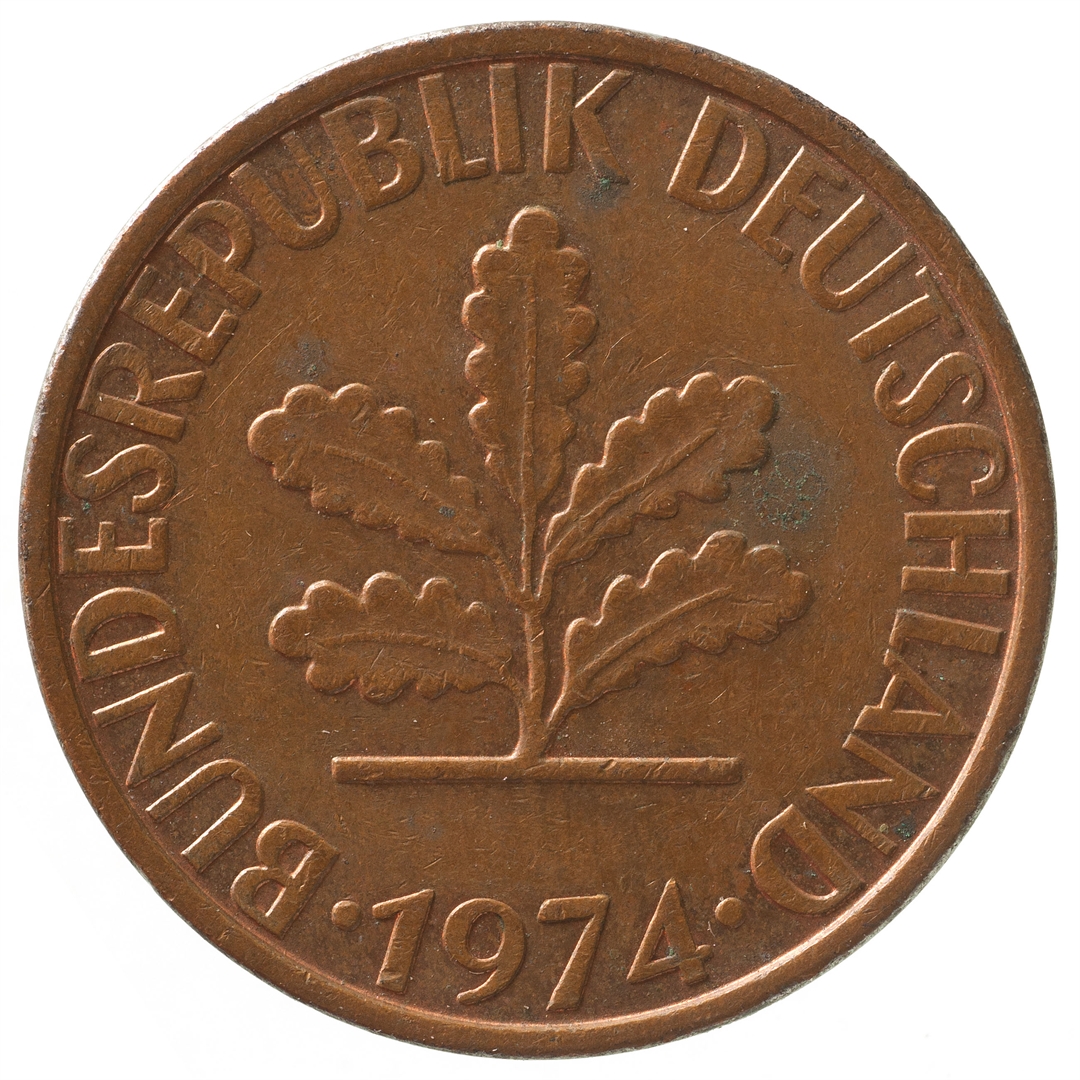 U sredini mladica hrasta s pet listova u vodoravnoj liniji. Uz rub ispisan tekst BUNDESREPUBLIK DEUTSCHLAND i godina 1974.