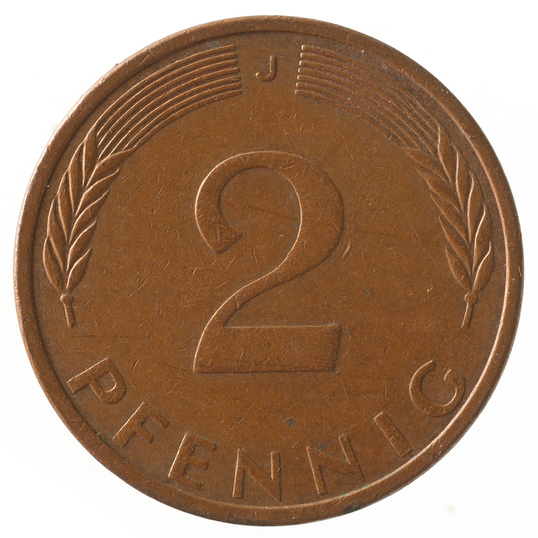 U sredini broj 2. Na vrhu slovo J (oznaka kovnice), a uz donji rub riječ PFENNIG.