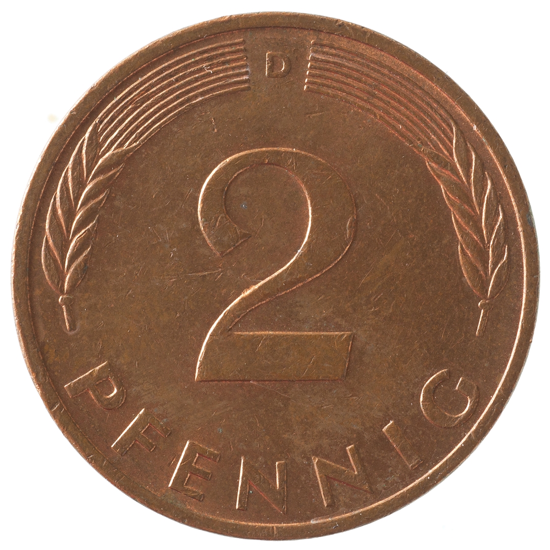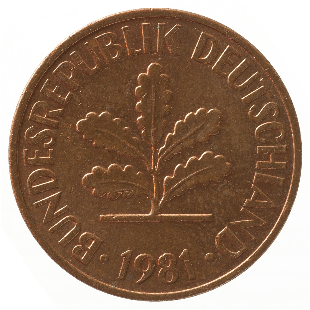 Avers: U sredini mladica hrasta s pet listova u vodoravnoj liniji. Uz rub ispisan tekst BUNDESREPUBLIK DEUTSCHLAND i godina 1981. Revers: U sredini broj 2. Na vrhu slovo F (oznaka kovnice), a uz donji rub riječ PFENNIG.