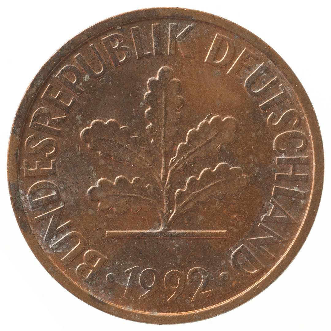 Avers: U sredini mladica hrasta s pet listova u vodoravnoj liniji. Uz rub ispisan tekst BUNDESREPUBLIK DEUTSCHLAND i godina 1992. Revers: U sredini broj 2. Na vrhu slovo D (oznaka kovnice), a uz donji rub riječ PFENNIG.