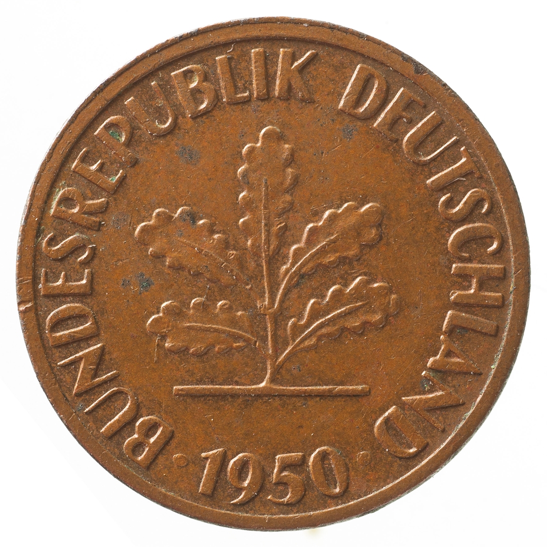 U sredini mladica hrasta s pet listova u vodoravnoj liniji. Uz rub ispisan tekst BUNDESREPUBLIK DEUTSCHLAND i godina 1950.
