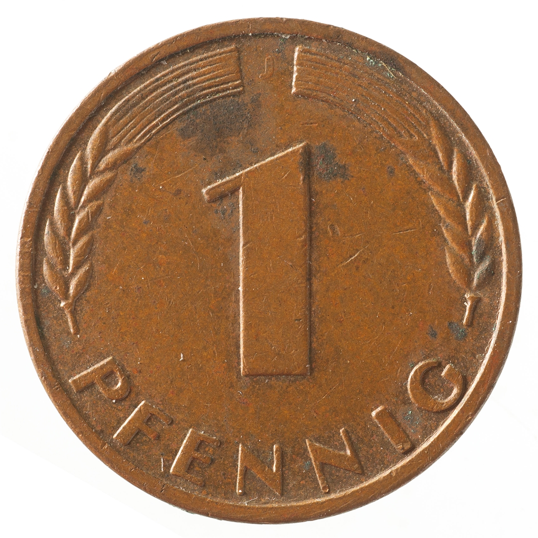 U sredini broj 1. Na vrhu slovo J (oznaka kovnice), a uz donji rub riječ PFENNIG.