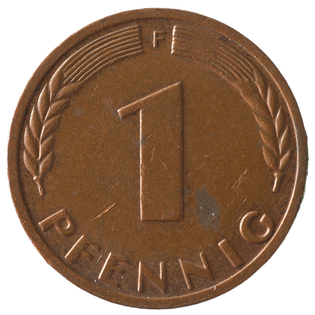 Avers: U sredini mladica hrasta s pet listova u vodoravnoj liniji. Uz rub ispisan tekst BUNDESREPUBLIK DEUTSCHLAND i godina 1950. Revers: U sredini broj 1. Na vrhu slovo F (oznaka kovnice), a uz donji rub riječ PFENNIG.