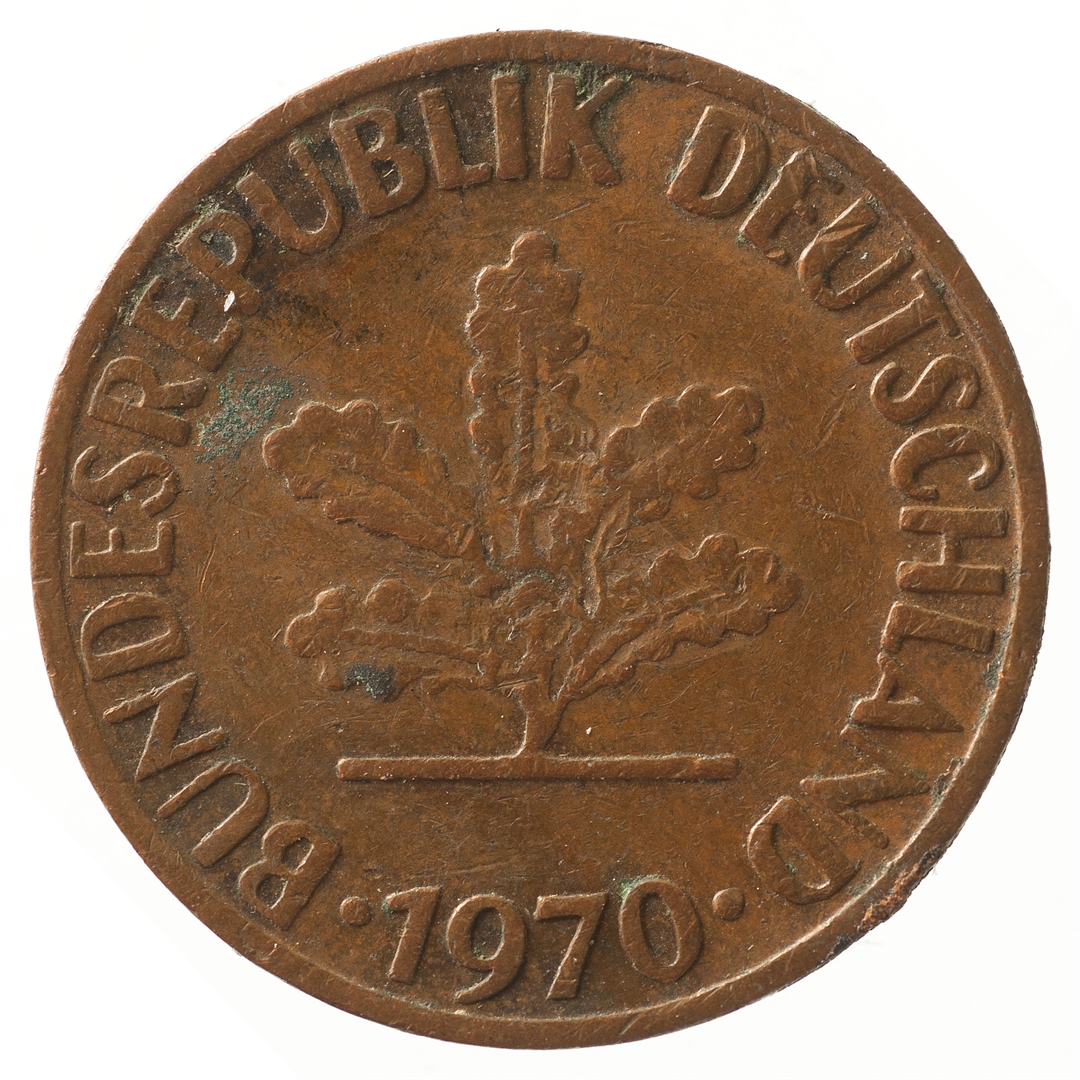 U sredini mladica hrasta s pet listova u vodoravnoj liniji. Uz rub ispisan tekst BUNDESREPUBLIK DEUTSCHLAND i godina 1970.