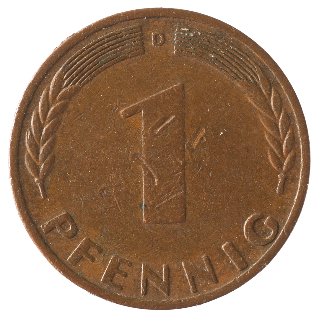 U sredini broj 1. Na vrhu slovo D (oznaka kovnice), a uz donji rub riječ PFENNIG.