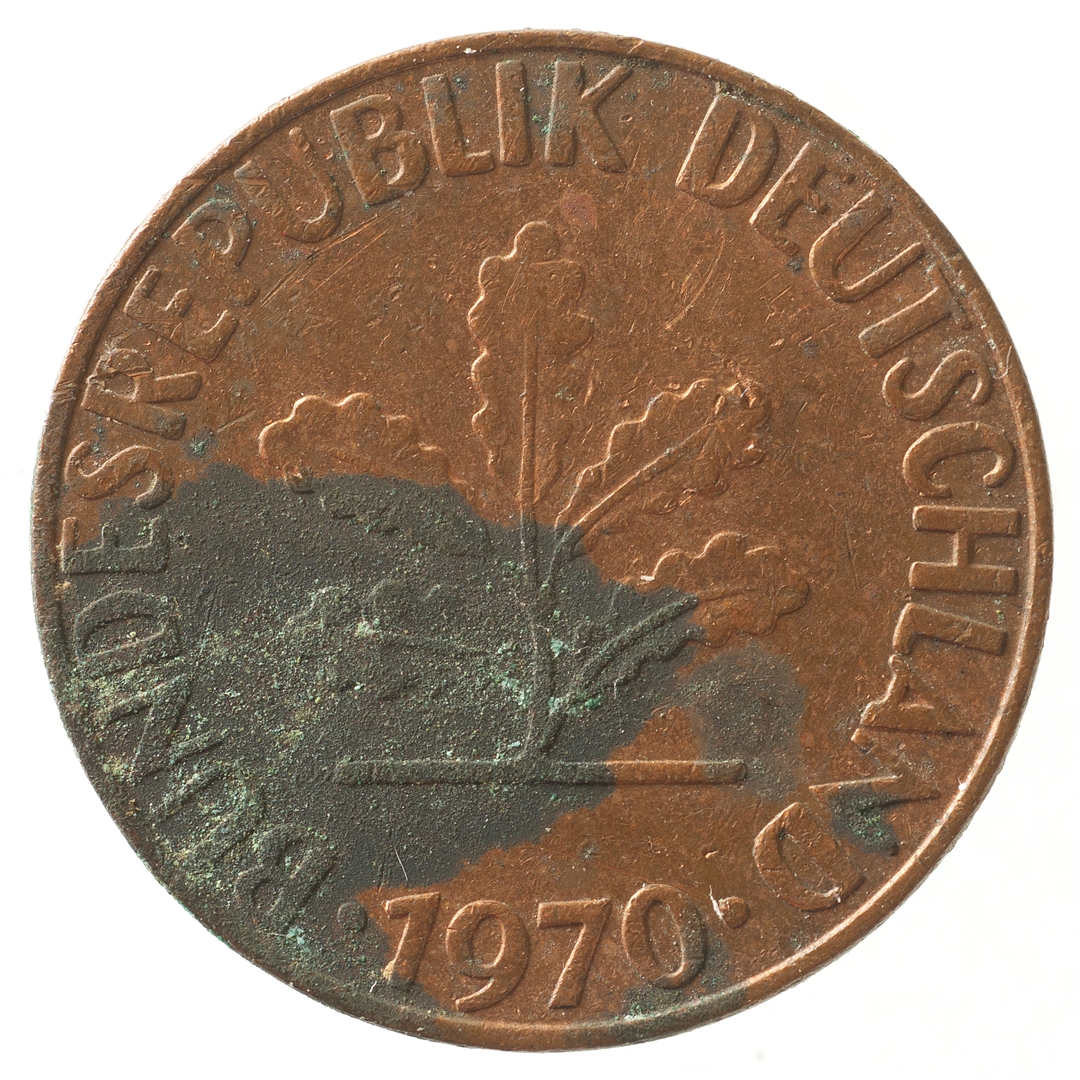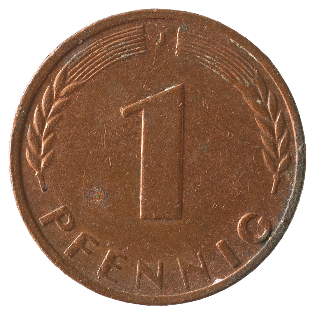 Avers: U sredini mladica hrasta s pet listova u vodoravnoj liniji. Uz rub ispisan tekst BUNDESREPUBLIK DEUTSCHLAND i godina 1970. Revers: U sredini broj 1. Na vrhu slovo J (oznaka kovnice), a uz donji rub riječ PFENNIG.