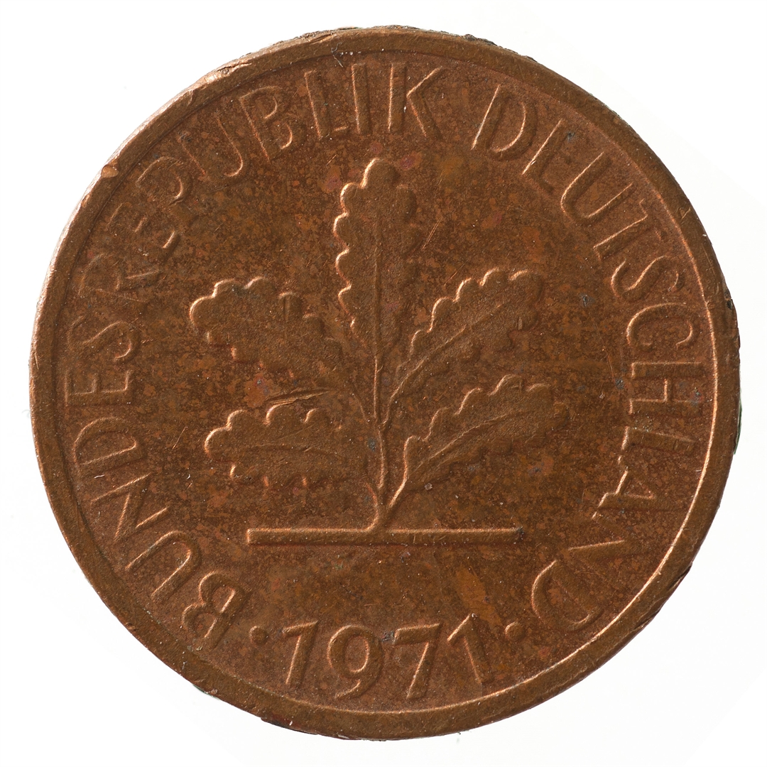 U sredini mladica hrasta s pet listova u vodoravnoj liniji. Uz rub ispisan tekst BUNDESREPUBLIK DEUTSCHLAND i godina 1971.