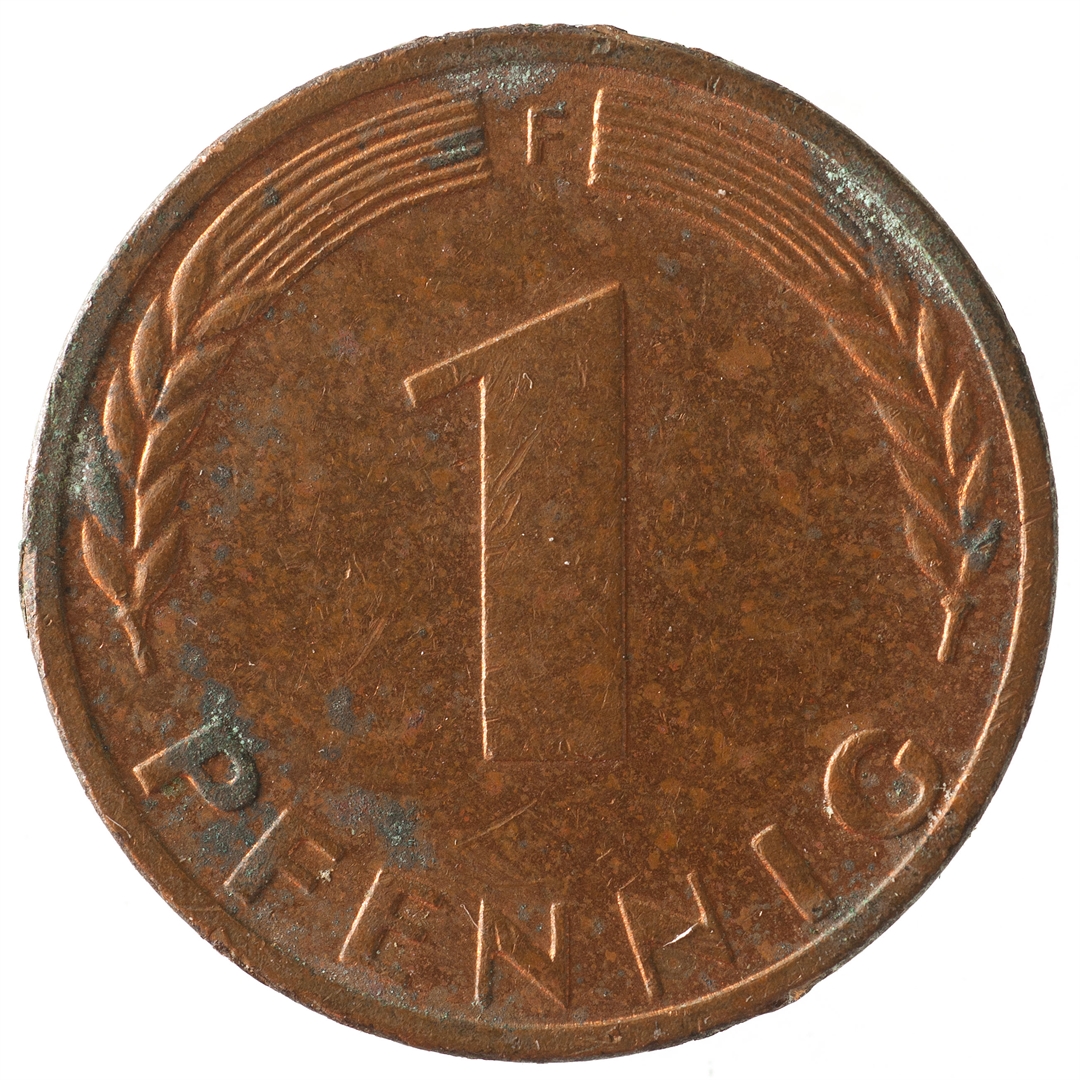 U sredini broj 1. Na vrhu slovo F (oznaka kovnice), a uz donji rub riječ PFENNIG.