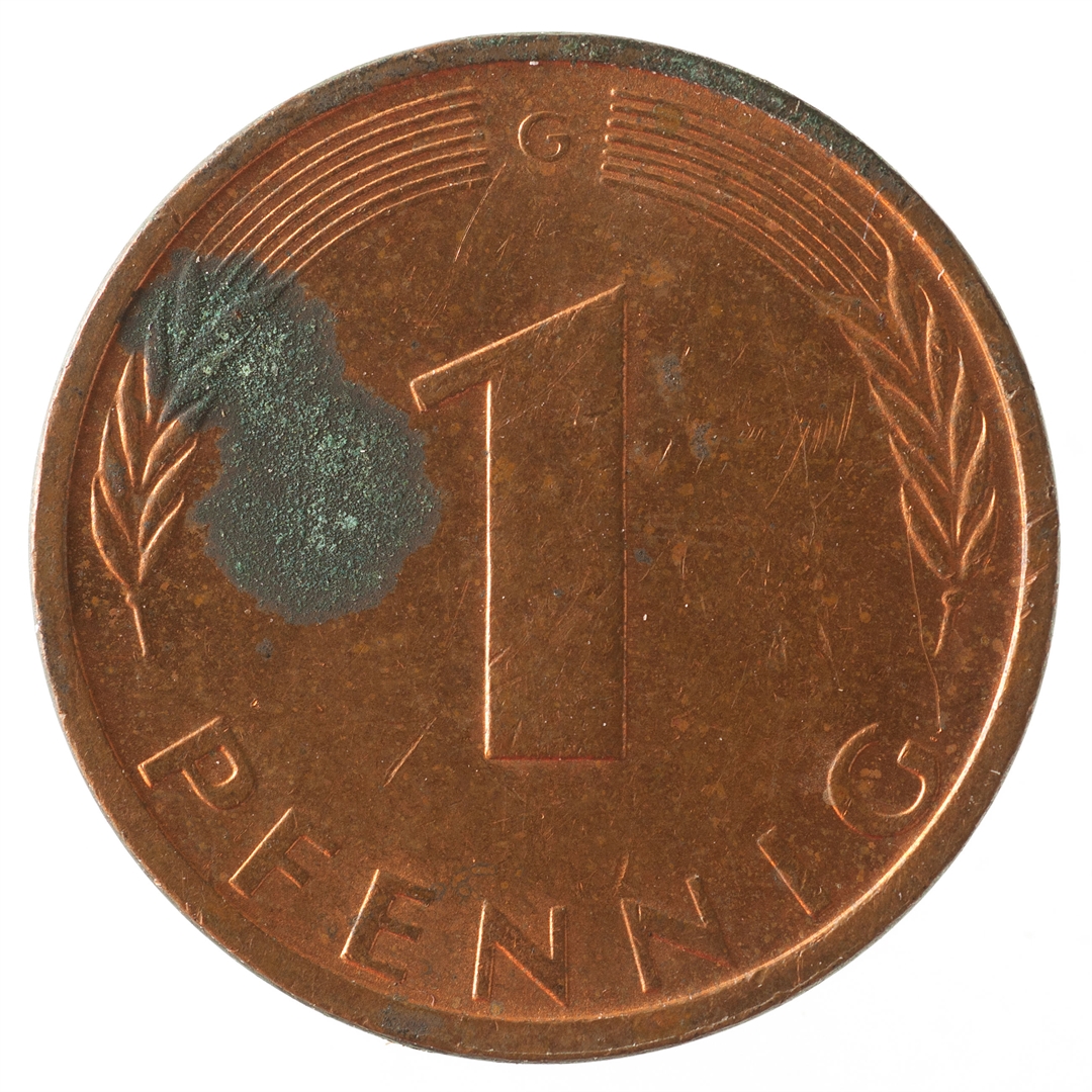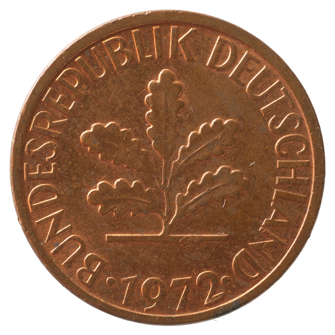 Avers: U sredini mladica hrasta s pet listova u vodoravnoj liniji. Uz rub ispisan tekst BUNDESREPUBLIK DEUTSCHLAND i godina 1972. Revers: U sredini broj 1. Na vrhu slovo G (oznaka kovnice), a uz donji rub riječ PFENNIG.