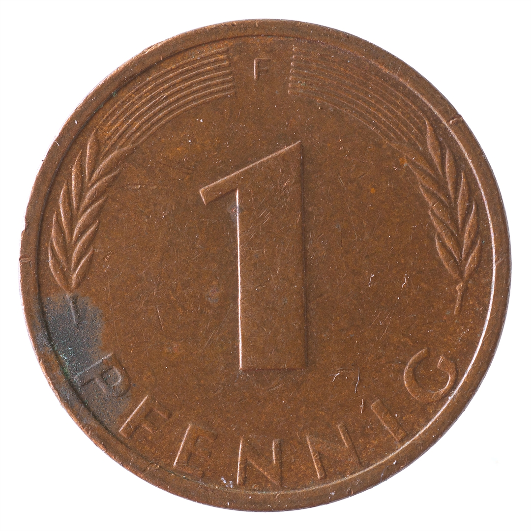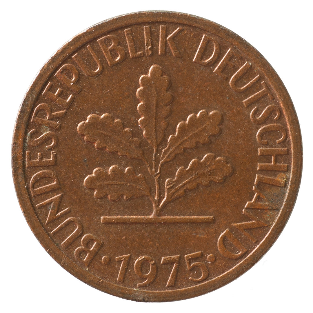Avers: U sredini mladica hrasta s pet listova u vodoravnoj liniji. Uz rub ispisan tekst BUNDESREPUBLIK DEUTSCHLAND i godina 1975. Revers: U sredini broj 1. Na vrhu slovo F (oznaka kovnice), a uz donji rub riječ PFENNIG.