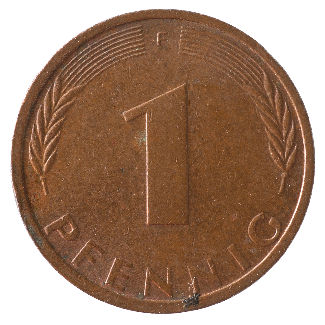 U sredini broj 1. Na vrhu slovo F (oznaka kovnice), a uz donji rub riječ PFENNIG.