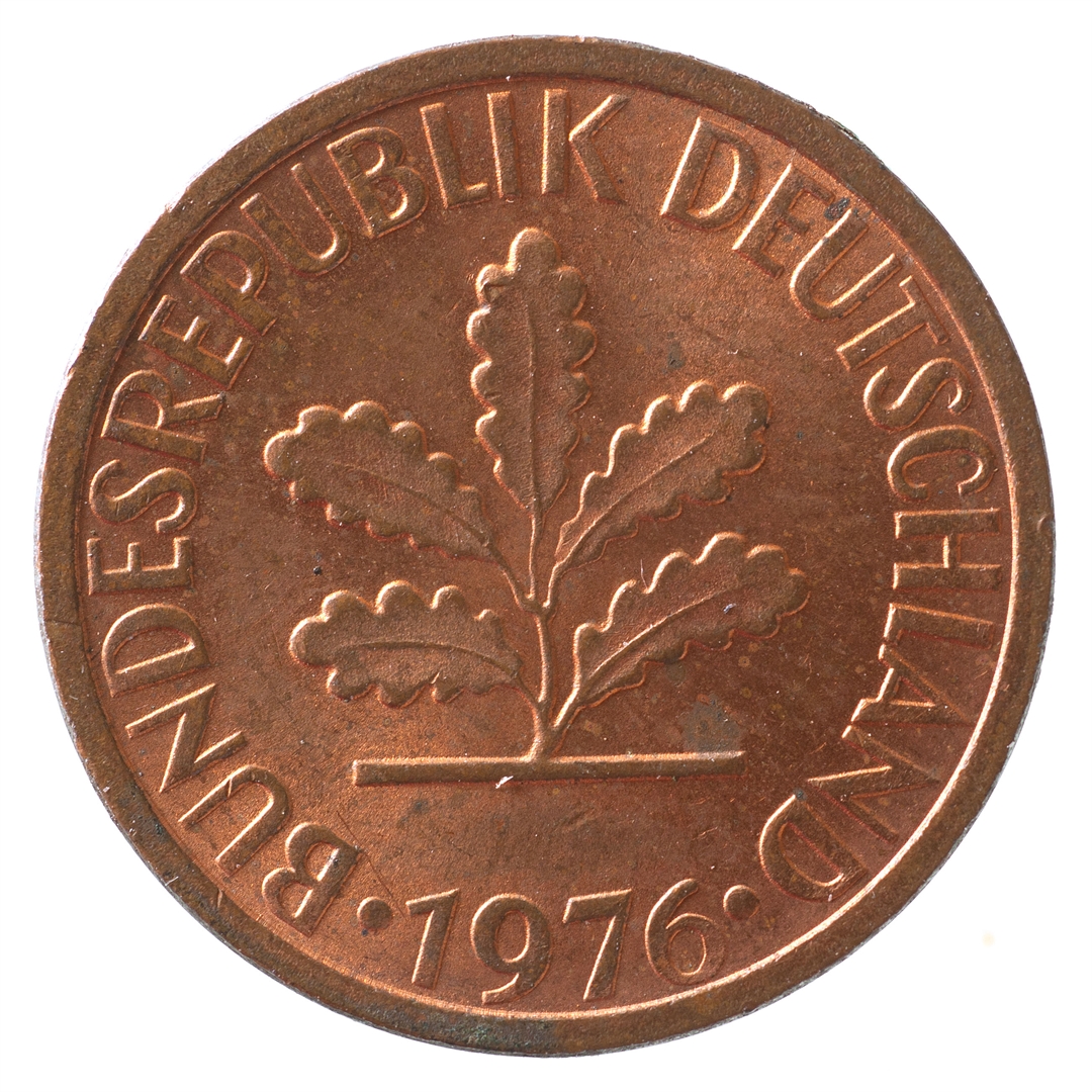 U sredini mladica hrasta s pet listova u vodoravnoj liniji. Uz rub ispisan tekst BUNDESREPUBLIK DEUTSCHLAND i godina 1976.