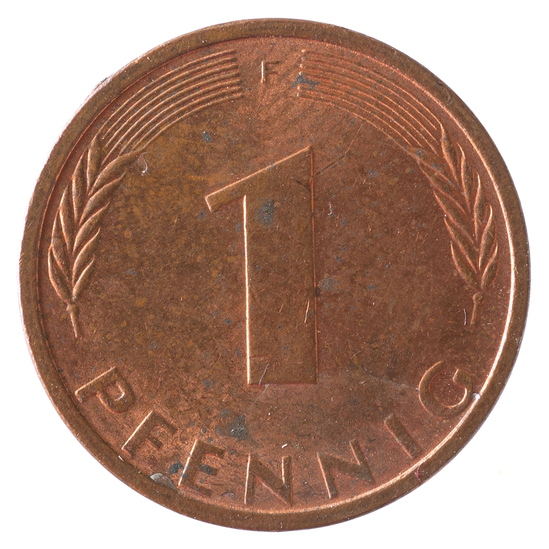 U sredini broj 1. Na vrhu slovo F (oznaka kovnice), a uz donji rub riječ PFENNIG.