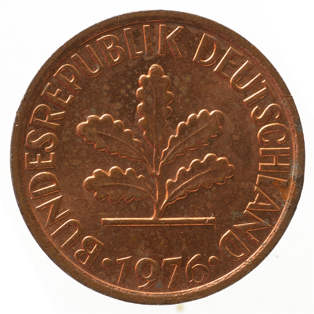 U sredini mladica hrasta s pet listova u vodoravnoj liniji. Uz rub ispisan tekst BUNDESREPUBLIK DEUTSCHLAND i godina 1976.