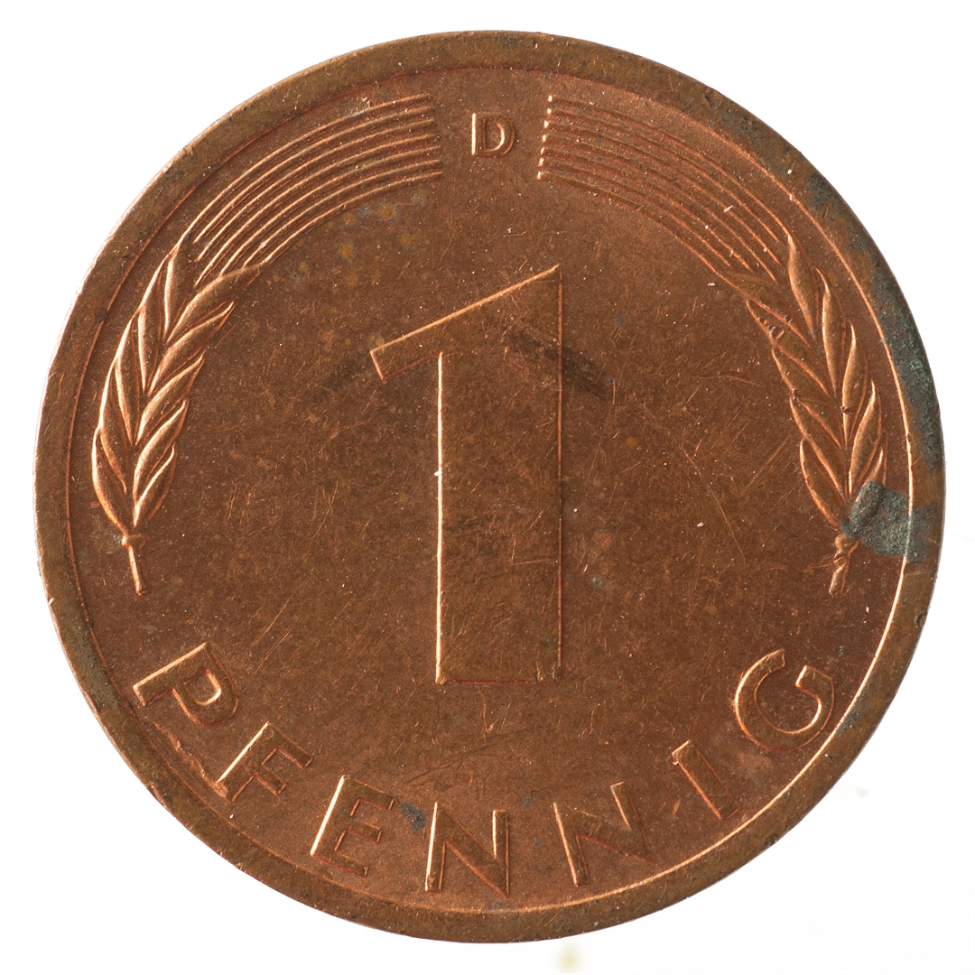 U sredini broj 1. Na vrhu slovo D (oznaka kovnice), a uz donji rub riječ PFENNIG.