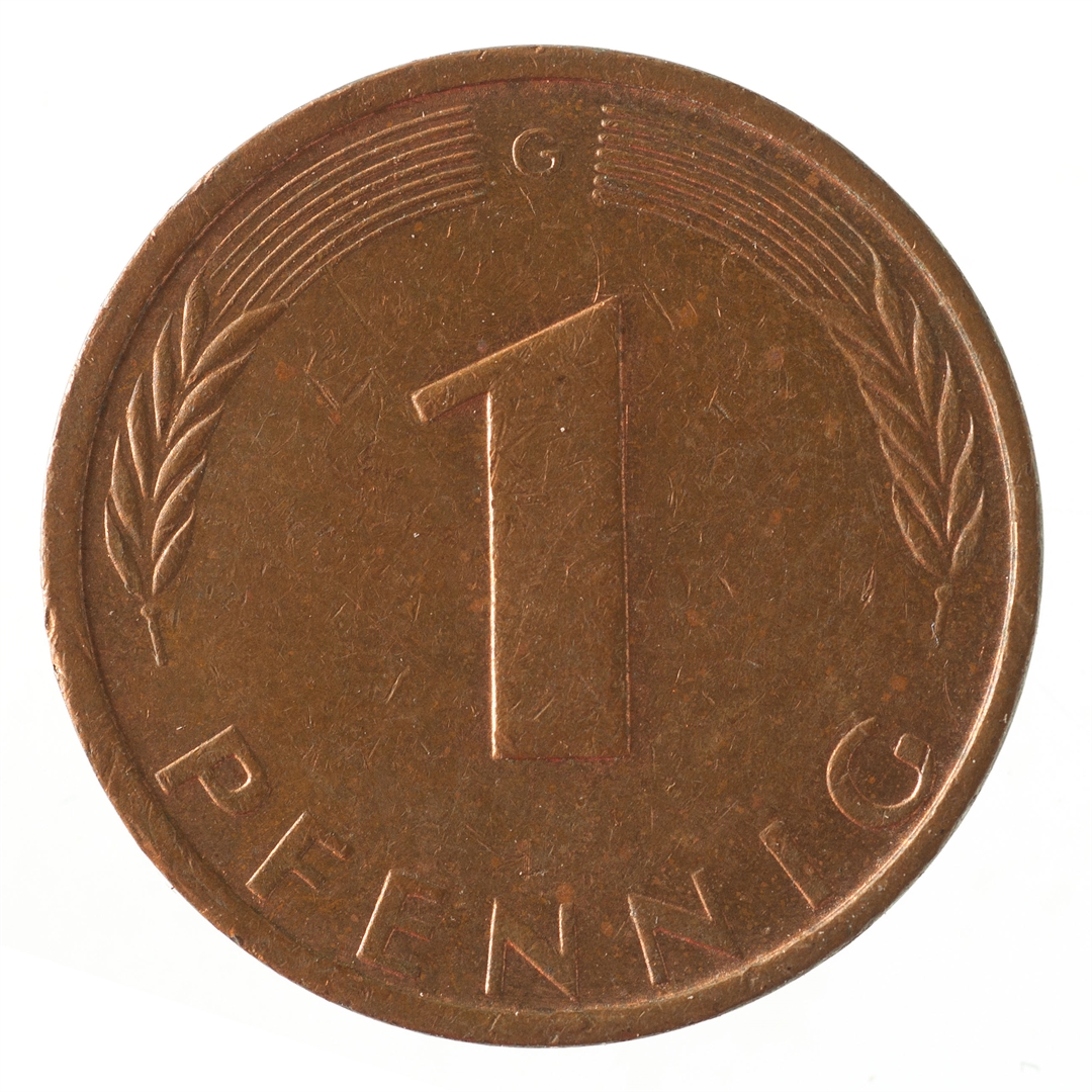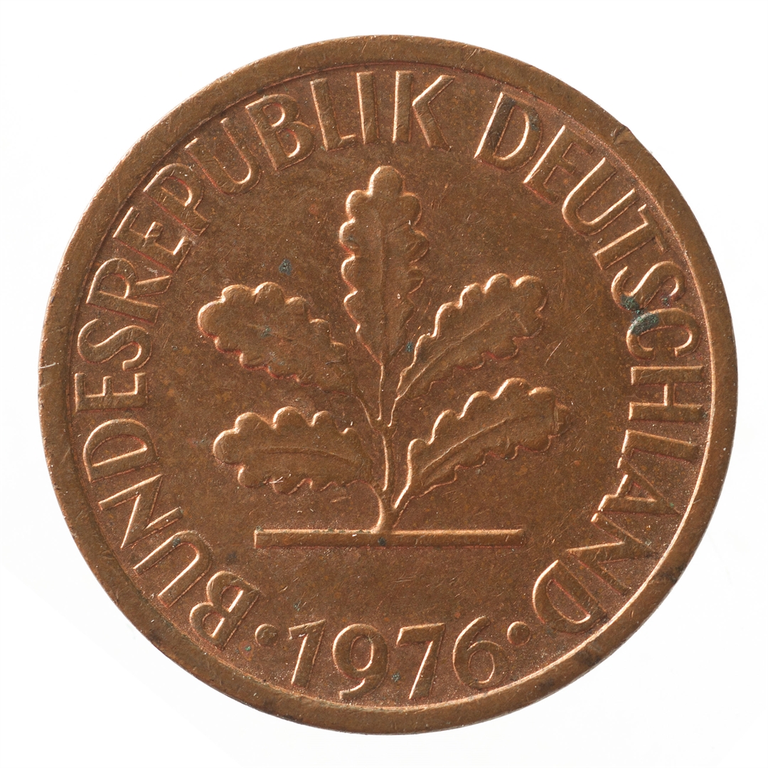 Avers: U sredini mladica hrasta s pet listova u vodoravnoj liniji. Uz rub ispisan tekst BUNDESREPUBLIK DEUTSCHLAND i godina 1976. Revers: U sredini broj 1. Na vrhu slovo G (oznaka kovnice), a uz donji rub riječ PFENNIG.