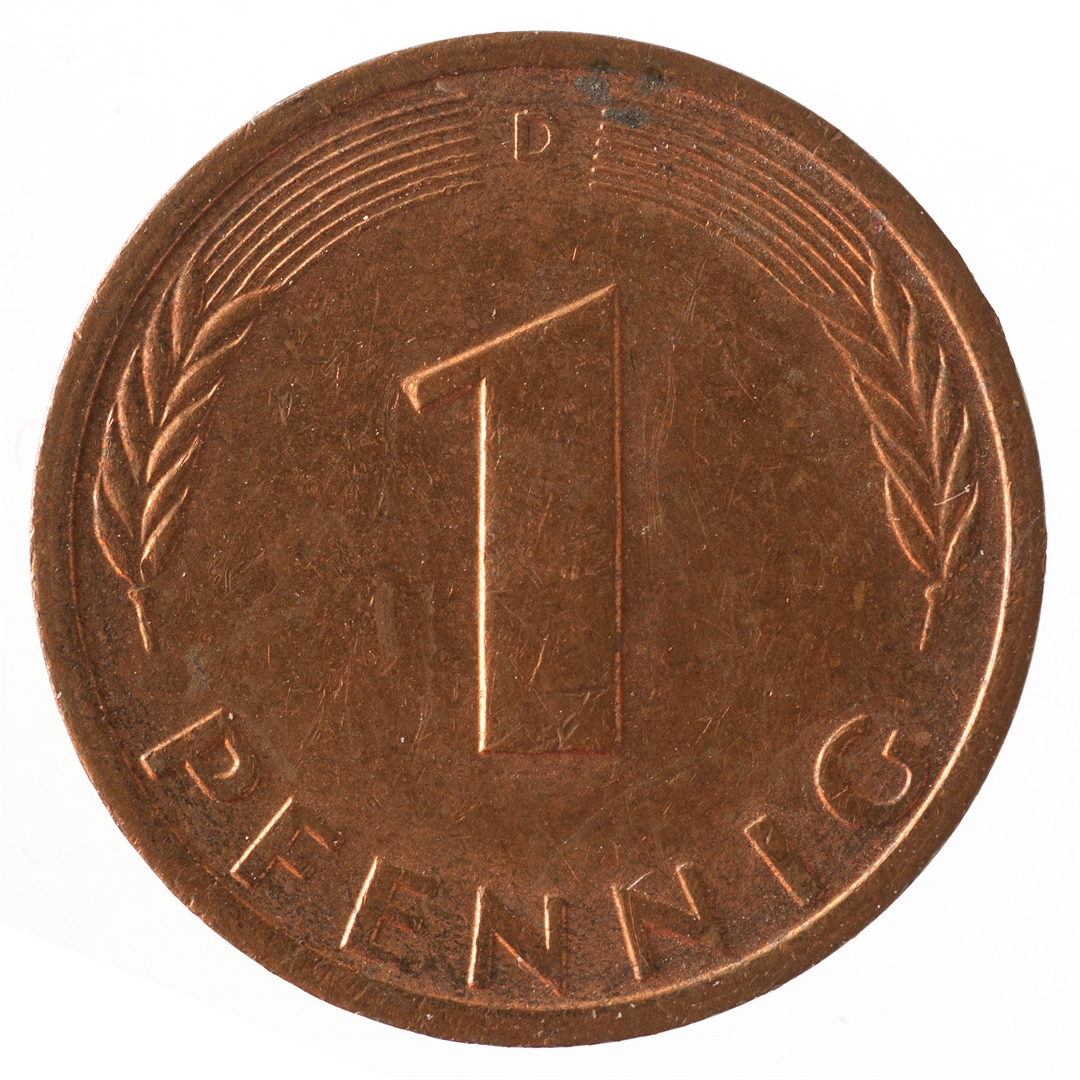 Avers: U sredini mladica hrasta s pet listova u vodoravnoj liniji. Uz rub ispisan tekst BUNDESREPUBLIK DEUTSCHLAND i godina 1977. Revers: U sredini broj 1. Na vrhu slovo D (oznaka kovnice), a uz donji rub riječ PFENNIG.