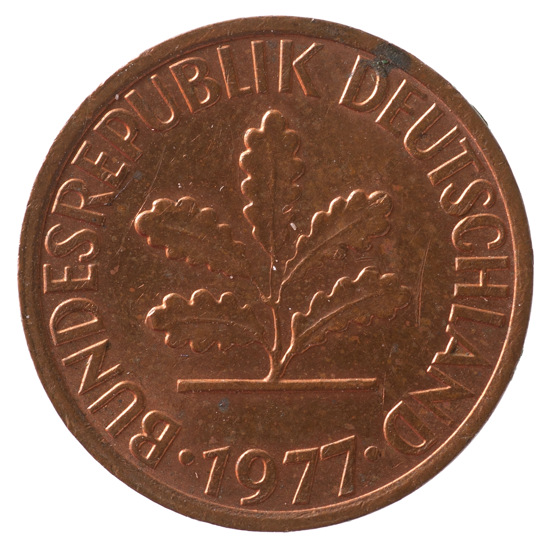U sredini mladica hrasta s pet listova u vodoravnoj liniji. Uz rub ispisan tekst BUNDESREPUBLIK DEUTSCHLAND i godina 1977.