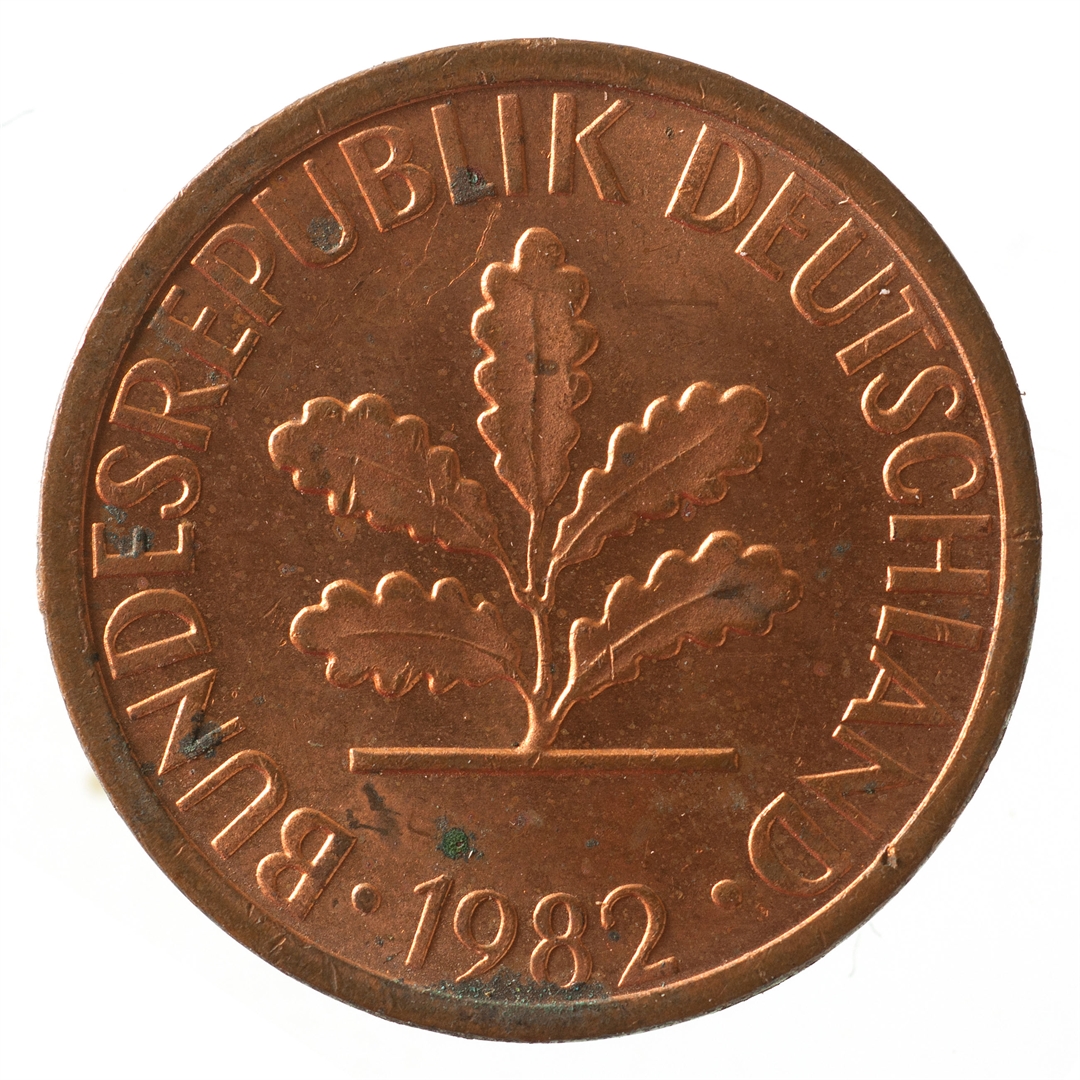 Avers: U sredini mladica hrasta s pet listova u vodoravnoj liniji. Uz rub ispisan tekst BUNDESREPUBLIK DEUTSCHLAND i godina 1982. Revers: U sredini broj 1. Na vrhu slovo G (oznaka kovnice), a uz donji rub riječ PFENNIG.