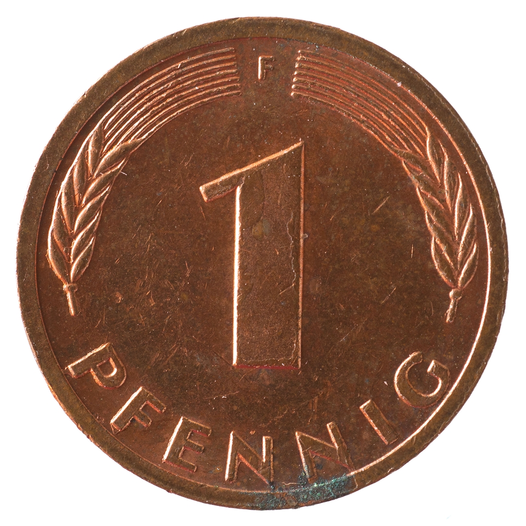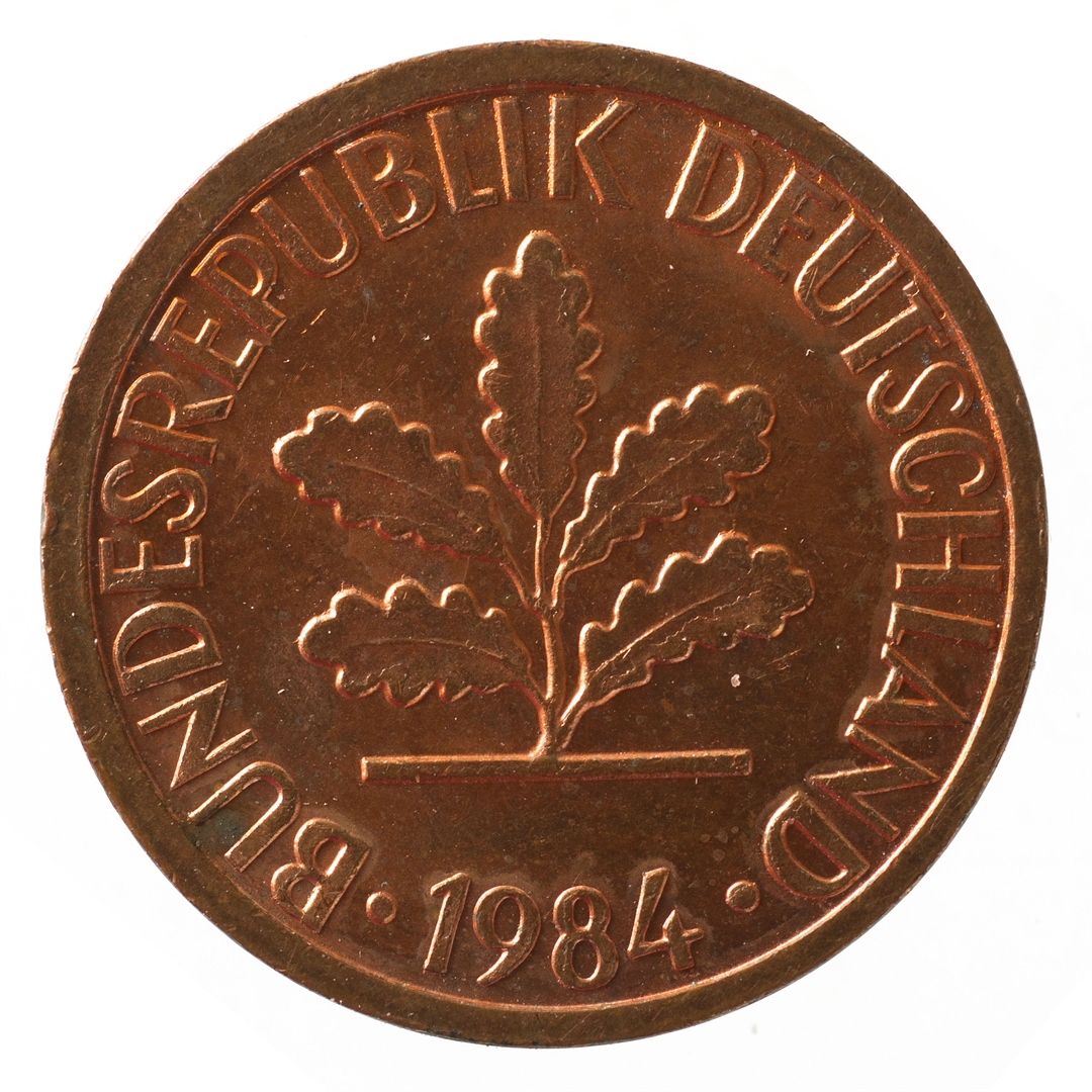 Avers: U sredini mladica hrasta s pet listova u vodoravnoj liniji. Uz rub ispisan tekst BUNDESREPUBLIK DEUTSCHLAND i godina 1984. Revers: U sredini broj 1. Na vrhu slovo F (oznaka kovnice), a uz donji rub riječ PFENNIG.